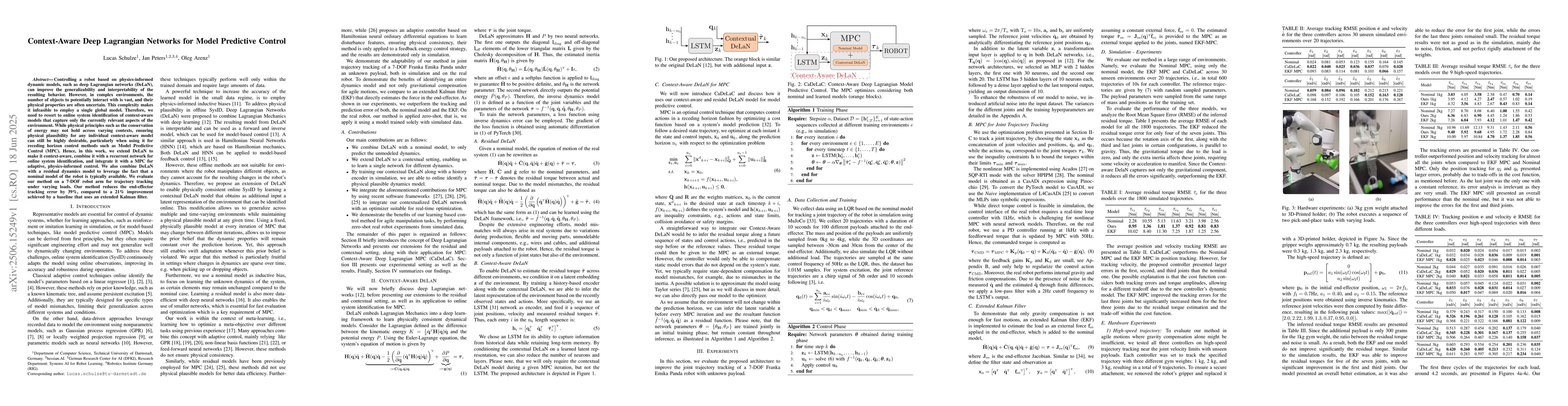 Controlling a robot based on physics-informed dynamic models, such as deep Lagrangian networks (DeLaN), can improve the generalizability and interpretability of the resulting behavior. However, in complex environments, the number of objects to potentially interact with is vast, and their physical properties are often uncertain. This complexity makes it infeasible to employ a single global model. Therefore, we need to resort to online system identification of context-aware models that capture only the currently relevant aspects of the environment. While physical principles such as the conservation of energy may not hold across varying contexts, ensuring physical plausibility for any individual context-aware model can still be highly desirable, particularly when using it for receding horizon control methods such as Model Predictive Control (MPC). Hence, in this work, we extend DeLaN to make it context-aware, combine it with a recurrent network for online system identification, and integrate it with a MPC for adaptive, physics-informed control. We also combine DeLaN with a residual dynamics model to leverage the fact that a nominal model of the robot is typically available. We evaluate our method on a 7-DOF robot arm for trajectory tracking under varying loads. Our method reduces the end-effector tracking error by 39%, compared to a 21% improvement achieved by a baseline that uses an extended Kalman filter.