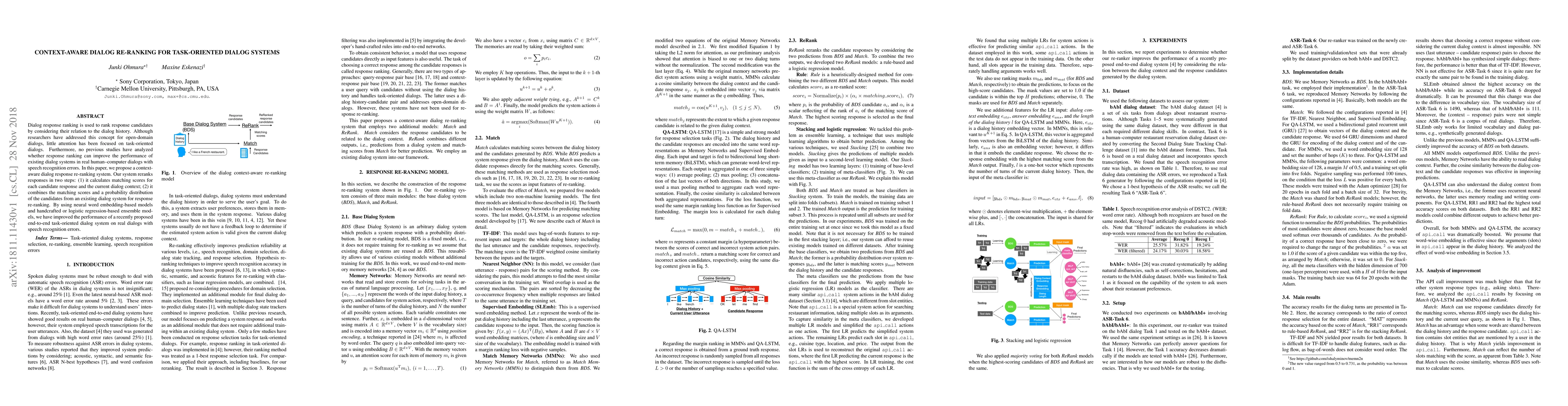 This paper proposes a context-aware dialog response re-ranking system to enhance task-oriented dialog systems, especially in scenarios with speech recognition errors. The system re-ranks responses by calculating matching scores and combining them with existing dialog system probabilities, leading to improved performance.
