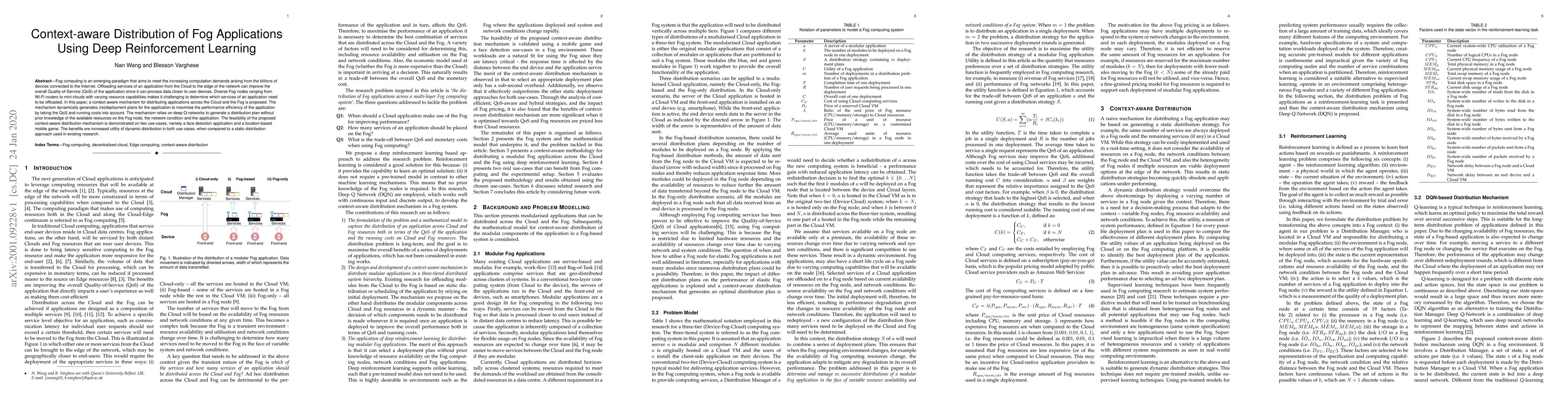 Fog computing is an emerging paradigm that aims to meet the increasing computation demands arising from the billions of devices connected to the Internet. Offloading services of an application from the Cloud to the edge of the network can improve the overall Quality-of-Service (QoS) of the application since it can process data closer to user devices. Diverse Fog nodes ranging from Wi-Fi routers to mini-clouds with varying resource capabilities makes it challenging to determine which services of an application need to be offloaded. In this paper, a context-aware mechanism for distributing applications across the Cloud and the Fog is proposed. The mechanism dynamically generates (re)deployment plans for the application to maximise the performance efficiency of the application by taking the QoS and running costs into account. The mechanism relies on deep Q-networks to generate a distribution plan without prior knowledge of the available resources on the Fog node, the network condition and the application. The feasibility of the proposed context-aware distribution mechanism is demonstrated on two use-cases, namely a face detection application and a location-based mobile game. The benefits are increased utility of dynamic distribution in both use cases, when compared to a static distribution approach used in existing research.