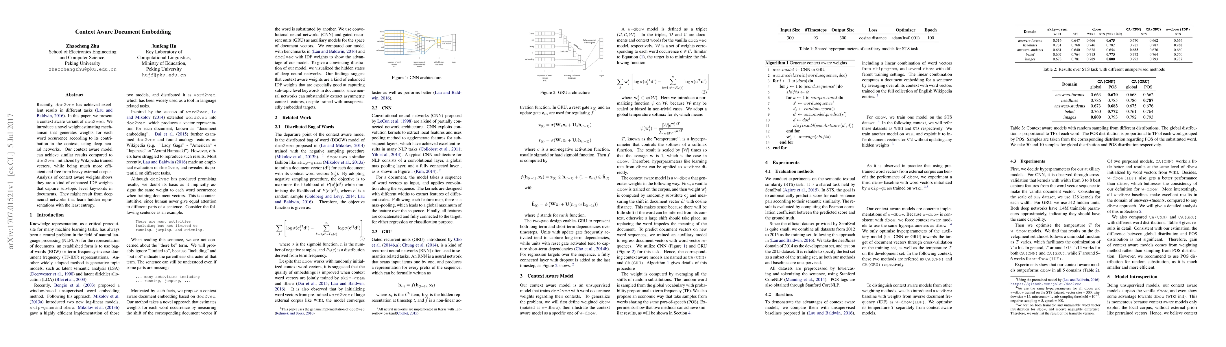 This paper introduces a context-aware variant of doc2vec that uses deep neural networks to generate weights for word occurrences based on their contextual contribution. The proposed model achieves comparable results to traditional doc2vec but is more efficient and does not require large external corpora.