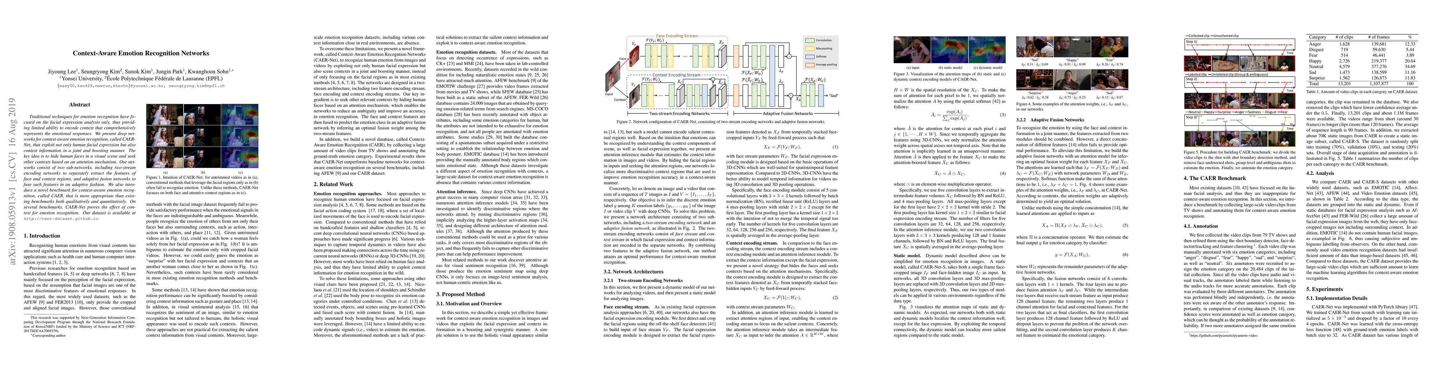 This paper introduces CAER-Net, a deep learning framework for context-aware emotion recognition that integrates facial expression and contextual information using an attention mechanism. The proposed two-stream encoding networks and adaptive fusion approach demonstrate improved emotion recognition performance over traditional methods.