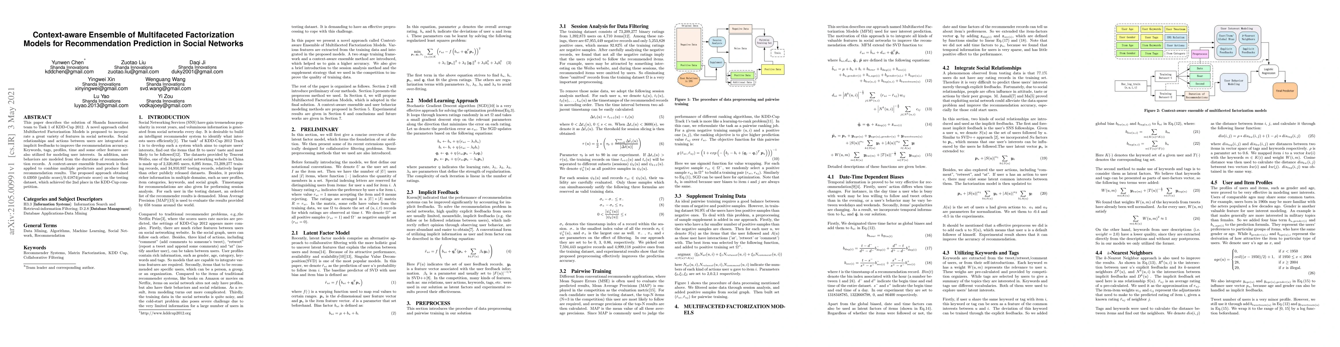 This paper describes the solution of Shanda Innovations team to Task 1 of KDD-Cup 2012. A novel approach called Multifaceted Factorization Models is proposed to incorporate a great variety of features in social networks. Social relationships and actions between users are integrated as implicit feedbacks to improve the recommendation accuracy. Keywords, tags, profiles, time and some other features are also utilized for modeling user interests. In addition, user behaviors are modeled from the durations of recommendation records. A context-aware ensemble framework is then applied to combine multiple predictors and produce final recommendation results. The proposed approach obtained 0.43959 (public score) / 0.41874 (private score) on the testing dataset, which achieved the 2nd place in the KDD-Cup competition.