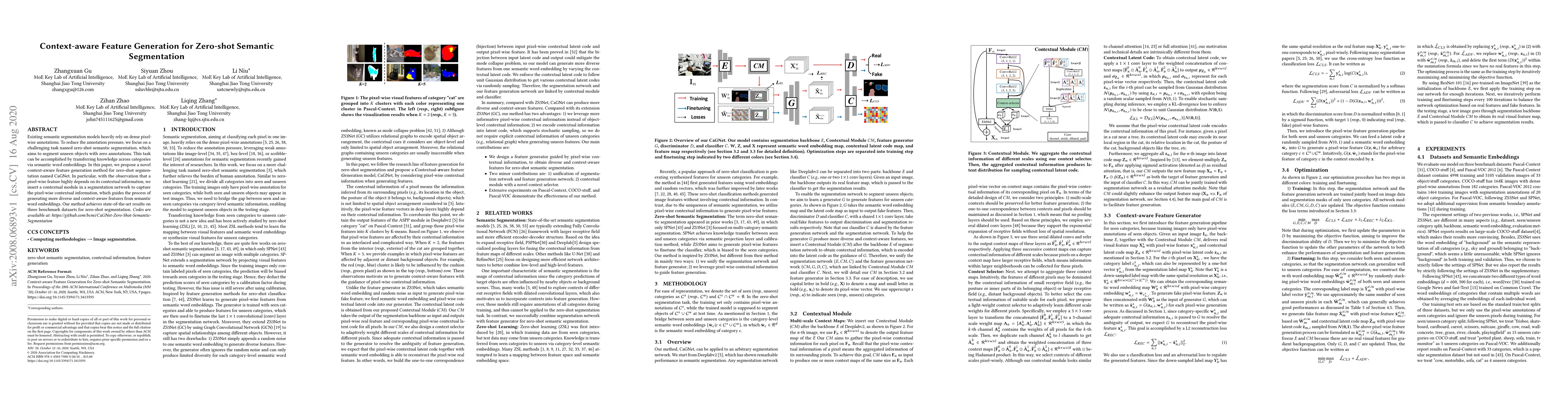 The paper introduces CaGNet, a context-aware feature generation method for zero-shot semantic segmentation, which leverages semantic word embeddings and contextual information to segment unseen objects without annotations, achieving top performance on benchmark datasets. The contextual module enhances the segmentation network to generate diverse features based on pixel-wise contextual data.
