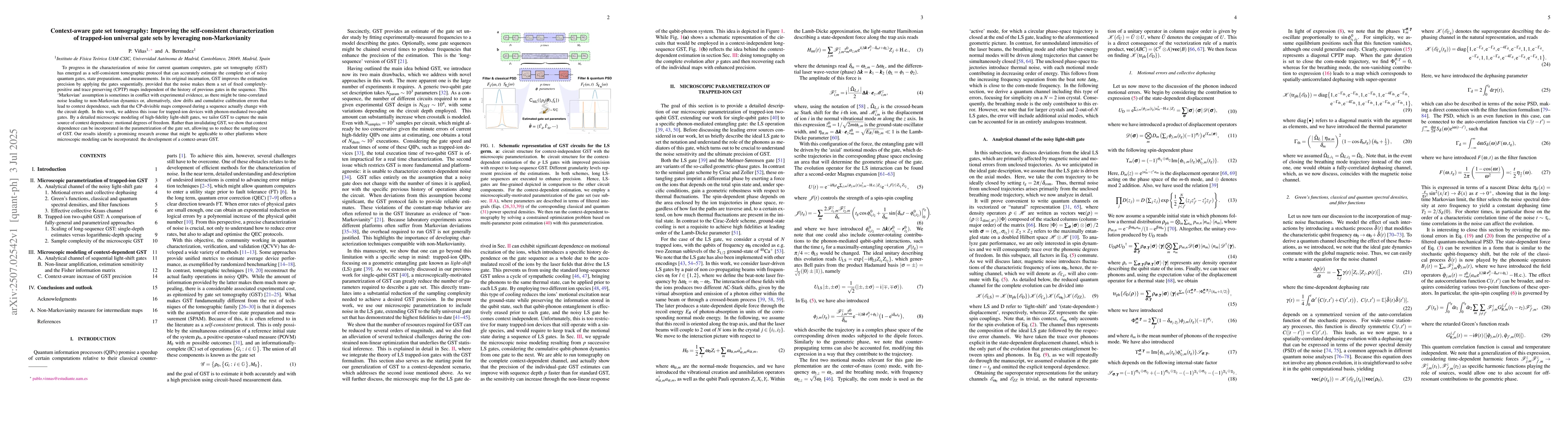 To progress in the characterization of noise for current quantum computers, gate set tomography (GST) has emerged as a self-consistent tomographic protocol that can accurately estimate the complete set of noisy quantum gates, state preparations, and measurements. In its original incarnation, GST improves the estimation precision by applying the gates sequentially, provided that the noise makes them a set of fixed completely-positive and trace preserving (CPTP) maps independent of the history of previous gates in the sequence. This 'Markovian' assumption is sometimes in conflict with experimental evidence, as there might be time-correlated noise leading to non-Markovian dynamics or, alternatively, slow drifts and cumulative calibration errors that lead to context dependence, such that the CP-divisible maps composed during a sequence actually change with the circuit depth. In this work, we address this issue for trapped-ion devices with phonon-mediated two-qubit gates. By a detailed microscopic modeling of high-fidelity light-shift gates, we tailor GST to capture the main source of context dependence: motional degrees of freedom. Rather than invalidating GST, we show that context dependence can be incorporated in the parametrization of the gate set, allowing us to reduce the sampling cost of GST. Our results identify a promising research avenue that might be applicable to other platforms where microscopic modeling can be incorporated: the development of a context-aware GST.