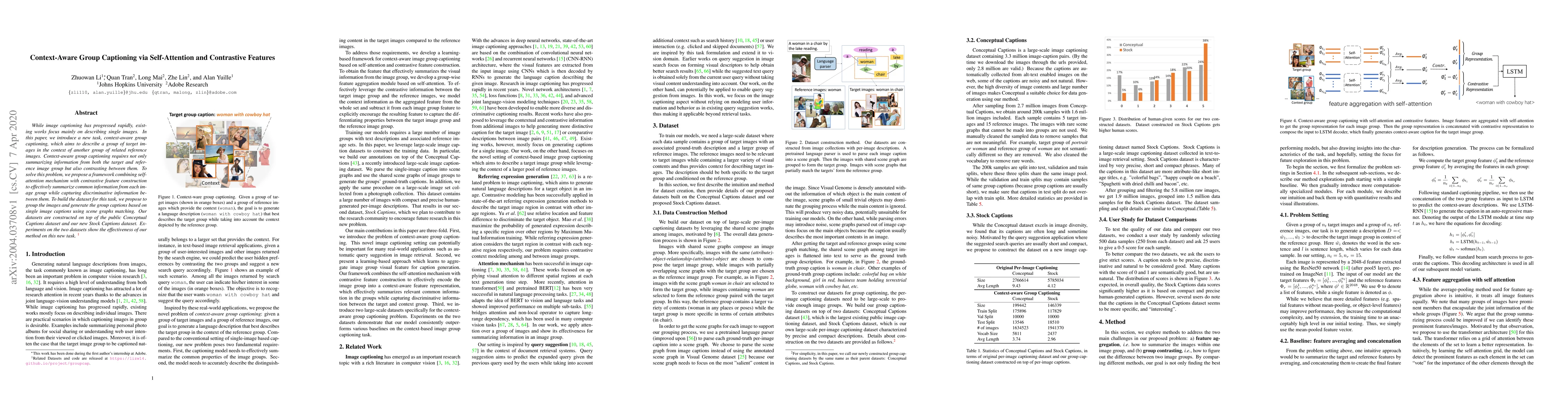 This paper introduces context-aware group captioning, a task that describes a set of target images in relation to a set of reference images, using a self-attention mechanism and contrastive feature construction to summarize and contrast information. The proposed framework is evaluated on new datasets constructed from existing single image caption datasets, demonstrating its effectiveness.