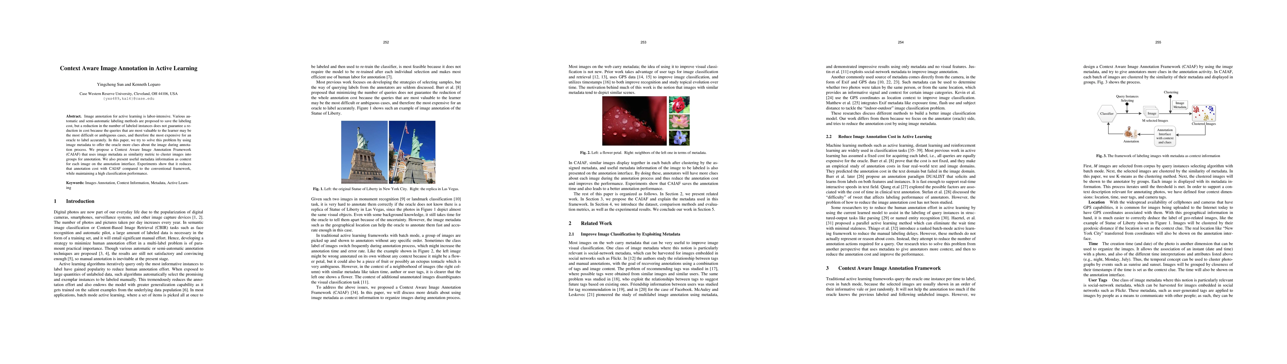 Image annotation for active learning is labor-intensive. Various automatic and semi-automatic labeling methods are proposed to save the labeling cost, but a reduction in the number of labeled instances does not guarantee a reduction in cost because the queries that are most valuable to the learner may be the most difficult or ambiguous cases, and therefore the most expensive for an oracle to label accurately. In this paper, we try to solve this problem by using image metadata to offer the oracle more clues about the image during annotation process. We propose a Context Aware Image Annotation Framework (CAIAF) that uses image metadata as similarity metric to cluster images into groups for annotation. We also present useful metadata information as context for each image on the annotation interface. Experiments show that it reduces that annotation cost with CAIAF compared to the conventional framework, while maintaining a high classification performance.