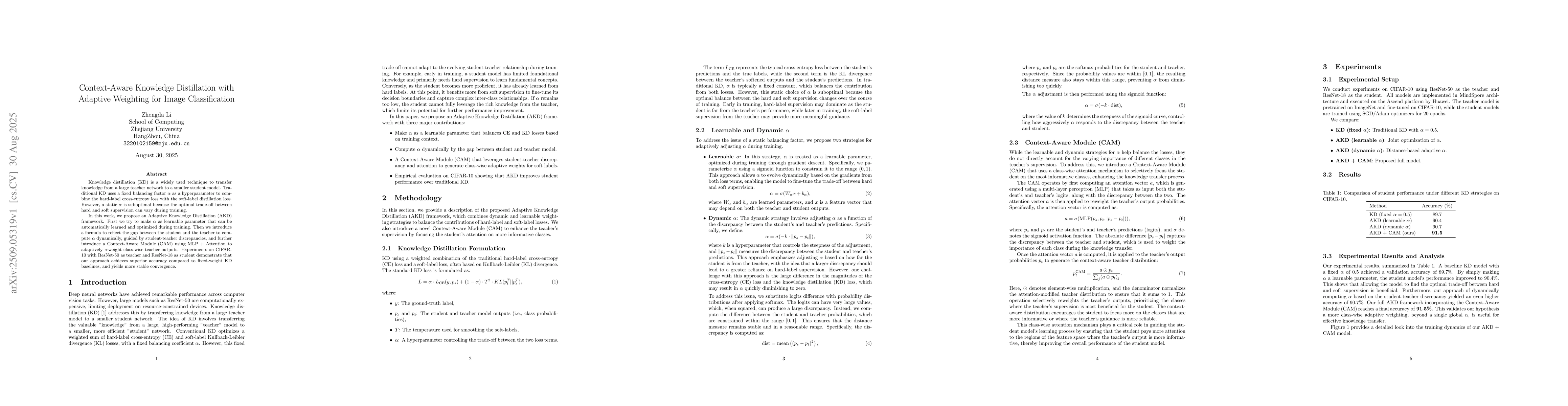 Knowledge distillation (KD) is a widely used technique to transfer knowledge from a large teacher network to a smaller student model. Traditional KD uses a fixed balancing factor alpha as a hyperparameter to combine the hard-label cross-entropy loss with the soft-label distillation loss. However, a static alpha is suboptimal because the optimal trade-off between hard and soft supervision can vary during training. In this work, we propose an Adaptive Knowledge Distillation (AKD) framework. First we try to make alpha as learnable parameter that can be automatically learned and optimized during training. Then we introduce a formula to reflect the gap between the student and the teacher to compute alpha dynamically, guided by student-teacher discrepancies, and further introduce a Context-Aware Module (CAM) using MLP + Attention to adaptively reweight class-wise teacher outputs. Experiments on CIFAR-10 with ResNet-50 as teacher and ResNet-18 as student demonstrate that our approach achieves superior accuracy compared to fixed-weight KD baselines, and yields more stable convergence.