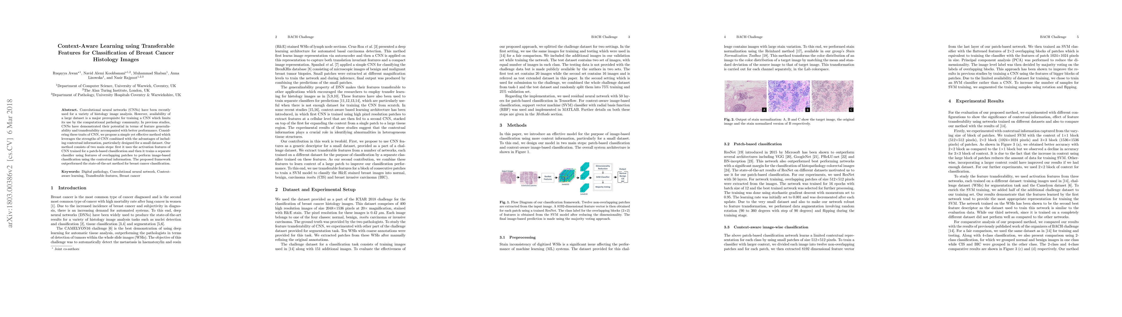 Convolutional neural networks (CNNs) have been recently used for a variety of histology image analysis. However, availability of a large dataset is a major prerequisite for training a CNN which limits its use by the computational pathology community. In previous studies, CNNs have demonstrated their potential in terms of feature generalizability and transferability accompanied with better performance. Considering these traits of CNN, we propose a simple yet effective method which leverages the strengths of CNN combined with the advantages of including contextual information, particularly designed for a small dataset. Our method consists of two main steps: first it uses the activation features of CNN trained for a patch-based classification and then it trains a separate classifier using features of overlapping patches to perform image-based classification using the contextual information. The proposed framework outperformed the state-of-the-art method for breast cancer classification.