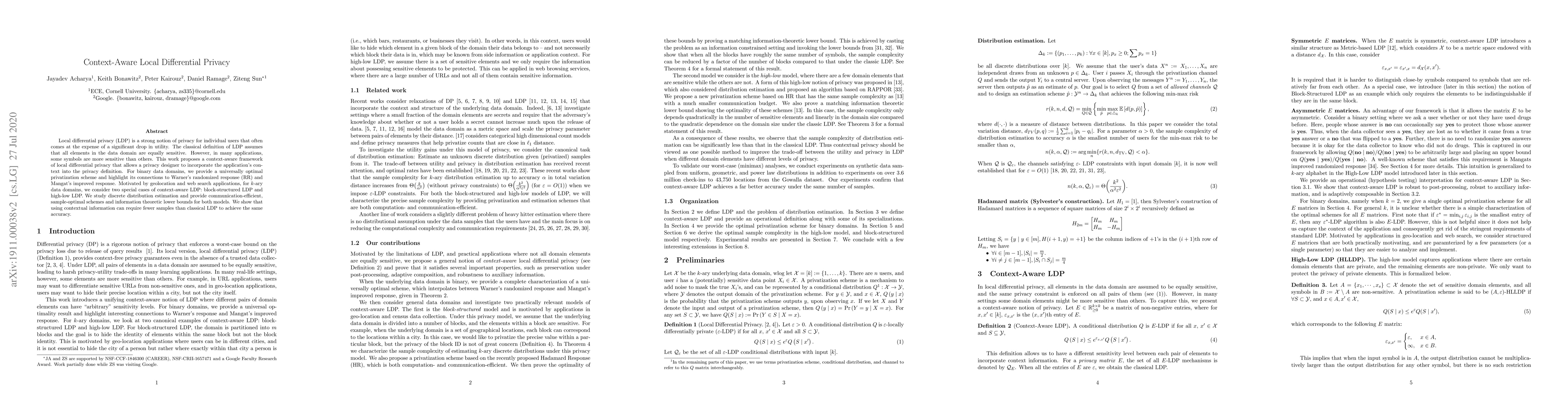 Local differential privacy (LDP) is a strong notion of privacy for individual users that often comes at the expense of a significant drop in utility. The classical definition of LDP assumes that all elements in the data domain are equally sensitive. However, in many applications, some symbols are more sensitive than others. This work proposes a context-aware framework of local differential privacy that allows a privacy designer to incorporate the application's context into the privacy definition. For binary data domains, we provide a universally optimal privatization scheme and highlight its connections to Warner's randomized response (RR) and Mangat's improved response. Motivated by geolocation and web search applications, for $k$-ary data domains, we consider two special cases of context-aware LDP: block-structured LDP and high-low LDP. We study discrete distribution estimation and provide communication-efficient, sample-optimal schemes and information-theoretic lower bounds for both models. We show that using contextual information can require fewer samples than classical LDP to achieve the same accuracy.