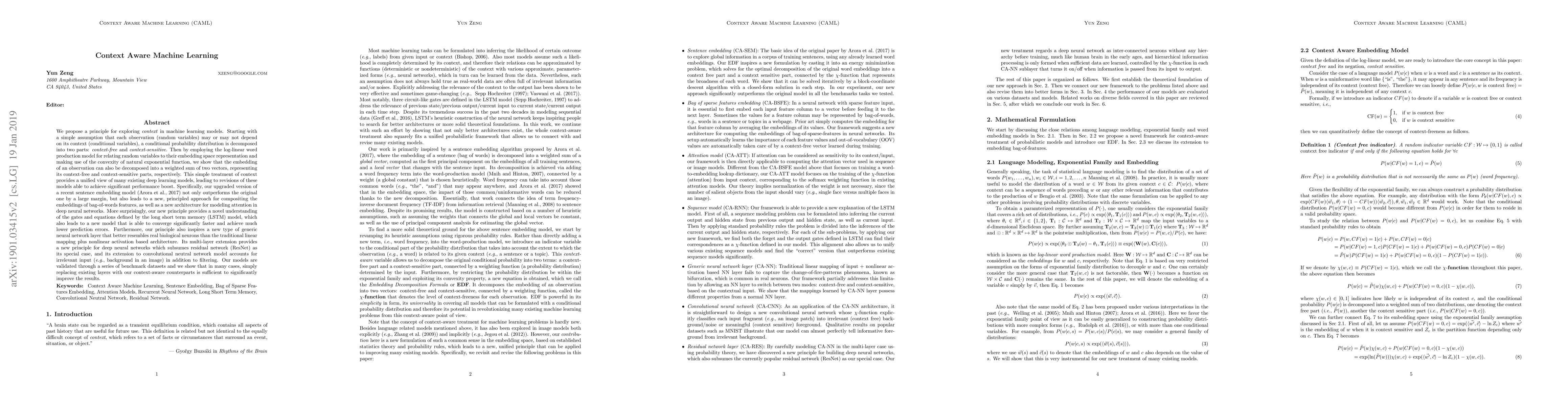 The paper introduces a new principle for incorporating context in machine learning models, decomposing conditional probability distributions and embeddings into context-free and context-sensitive parts. This approach unifies and enhances existing deep learning models, improving sentence embedding, attention mechanisms, and even long short-term memory models. It also inspires a new neural network layer mimicking biological neurons and extends to residual and convolutional networks, addressing irrelevant inputs.