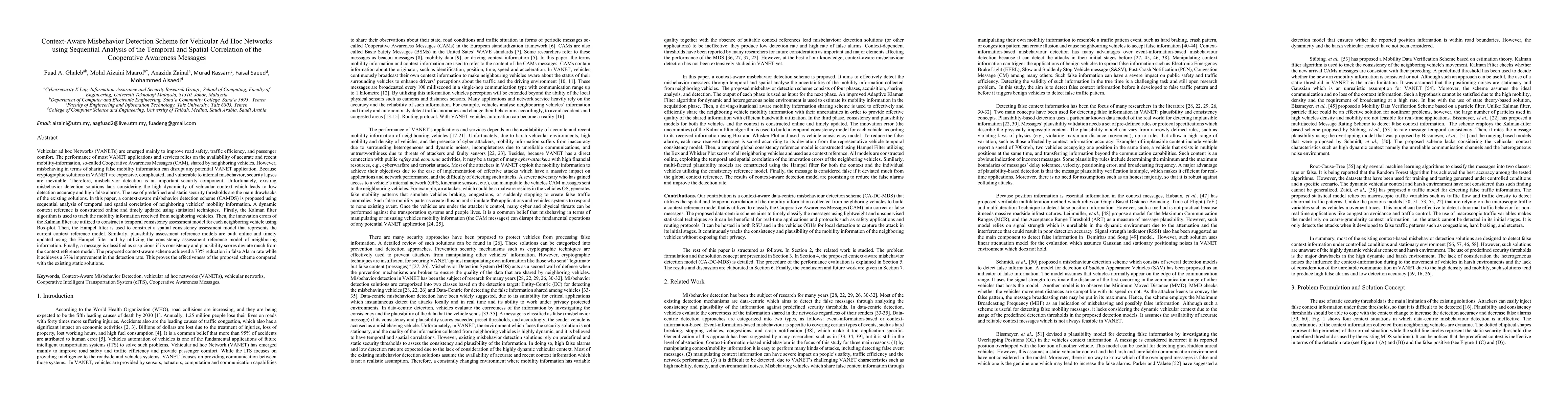 This paper proposes a context-aware misbehavior detection scheme (CAMDS) for Vehicular Ad Hoc Networks (VANETs) that leverages sequential analysis of temporal and spatial correlations in cooperative awareness messages. The CAMDS dynamically updates a context reference model using Kalman and Hampel filters, achieving a 73% reduction in false alarms and a 37% improvement in detection rates compared to static threshold methods.