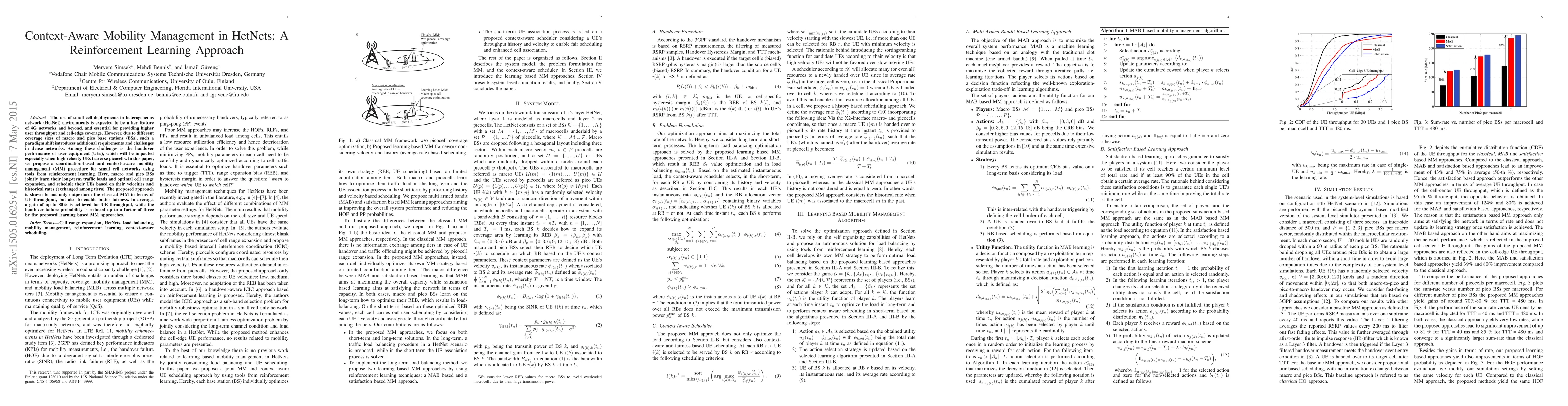 The use of small cell deployments in heterogeneous network (HetNet) environments is expected to be a key feature of 4G networks and beyond, and essential for providing higher user throughput and cell-edge coverage. However, due to different coverage sizes of macro and pico base stations (BSs), such a paradigm shift introduces additional requirements and challenges in dense networks. Among these challenges is the handover performance of user equipment (UEs), which will be impacted especially when high velocity UEs traverse picocells. In this paper, we propose a coordination-based and context-aware mobility management (MM) procedure for small cell networks using tools from reinforcement learning. Here, macro and pico BSs jointly learn their long-term traffic loads and optimal cell range expansion, and schedule their UEs based on their velocities and historical rates (exchanged among tiers). The proposed approach is shown to not only outperform the classical MM in terms of UE throughput, but also to enable better fairness. In average, a gain of up to 80\% is achieved for UE throughput, while the handover failure probability is reduced up to a factor of three by the proposed learning based MM approaches.