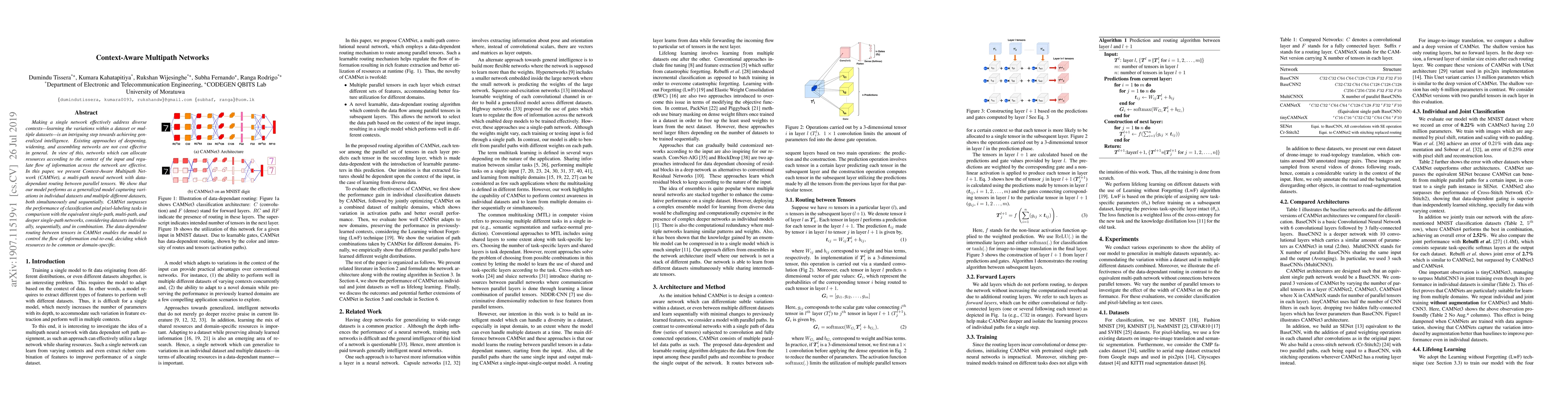 Making a single network effectively address diverse contexts---learning the variations within a dataset or multiple datasets---is an intriguing step towards achieving generalized intelligence. Existing approaches of deepening, widening, and assembling networks are not cost effective in general. In view of this, networks which can allocate resources according to the context of the input and regulate flow of information across the network are effective. In this paper, we present Context-Aware Multipath Network (CAMNet), a multi-path neural network with data-dependant routing between parallel tensors. We show that our model performs as a generalized model capturing variations in individual datasets and multiple different datasets, both simultaneously and sequentially. CAMNet surpasses the performance of classification and pixel-labeling tasks in comparison with the equivalent single-path, multi-path, and deeper single-path networks, considering datasets individually, sequentially, and in combination. The data-dependent routing between tensors in CAMNet enables the model to control the flow of information end-to-end, deciding which resources to be common or domain-specific.