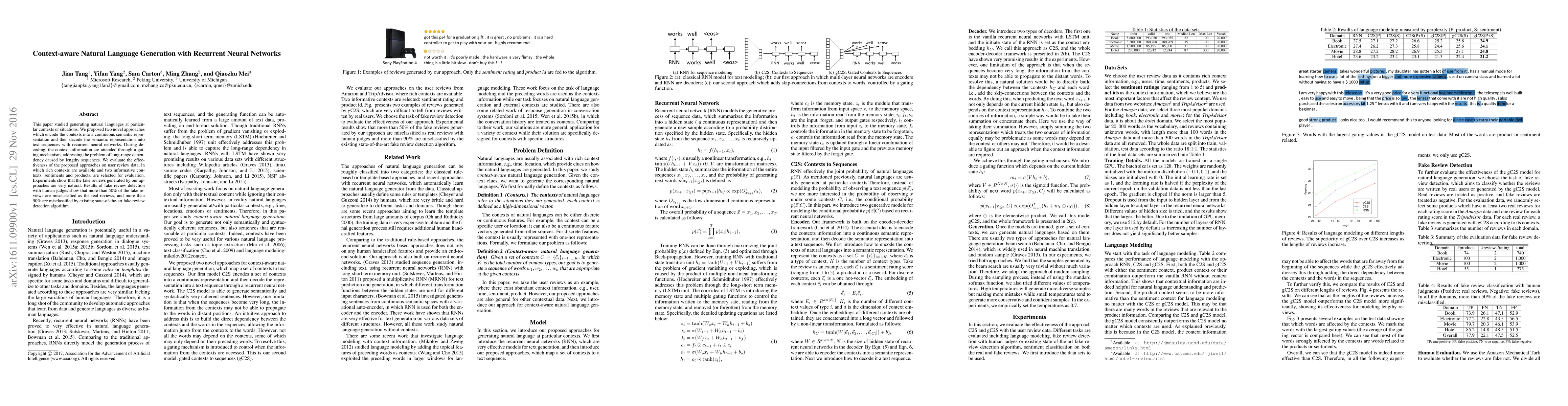 This paper proposes two novel approaches for context-aware natural language generation using recurrent neural networks, which encode contexts into continuous representations and decode them with a gating mechanism to address long-range dependencies. Experiments on user review data show that the generated fake reviews are highly natural and often misclassified by both human judges and existing detection algorithms.