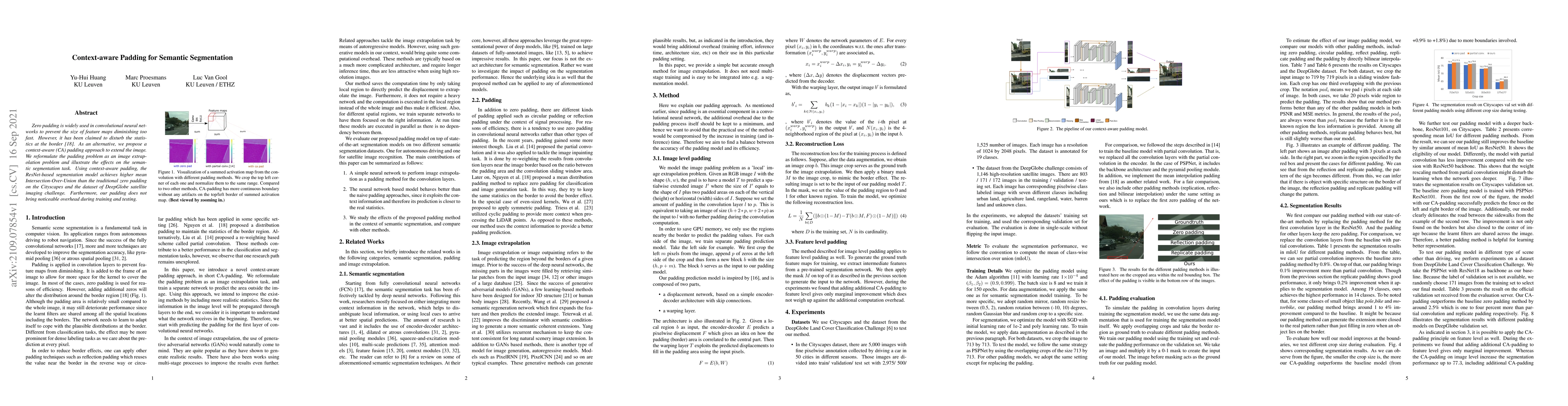 The paper proposes a context-aware (CA) padding approach for semantic segmentation, reformulating padding as an image extrapolation problem. It uses ResNet-based models and evaluates on Cityscapes and DeepGlobe datasets, comparing with zero padding, circular padding, reflect padding, replicate padding, and bilinear interpolation.