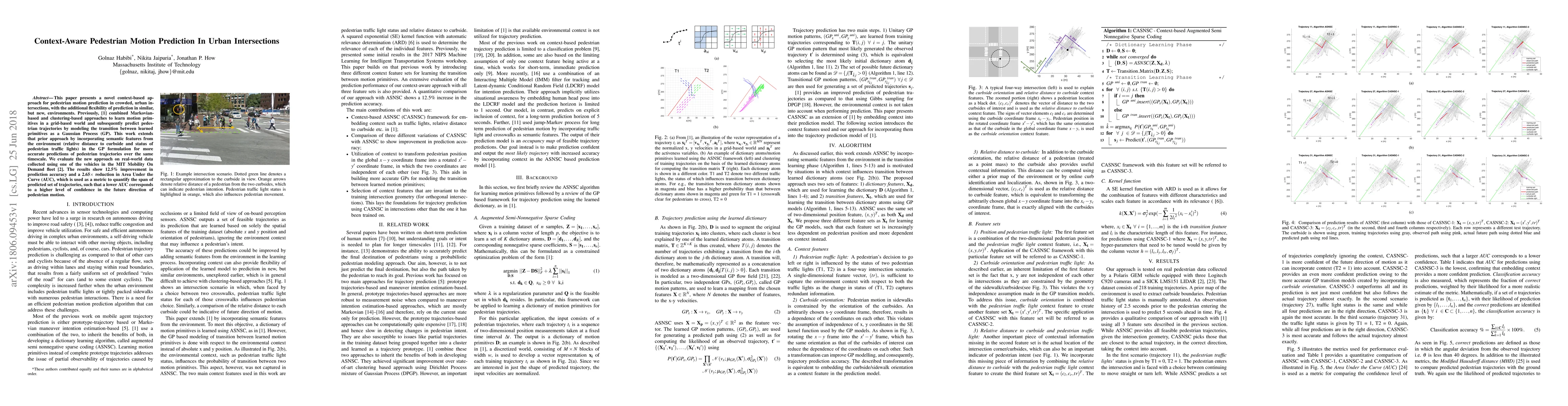 This paper introduces a novel context-aware approach for predicting pedestrian motion in urban intersections, incorporating semantic features to enhance Gaussian Process modeling. The method shows a 12.5% improvement in prediction accuracy and a 2.65 times reduction in AUC compared to previous methods.