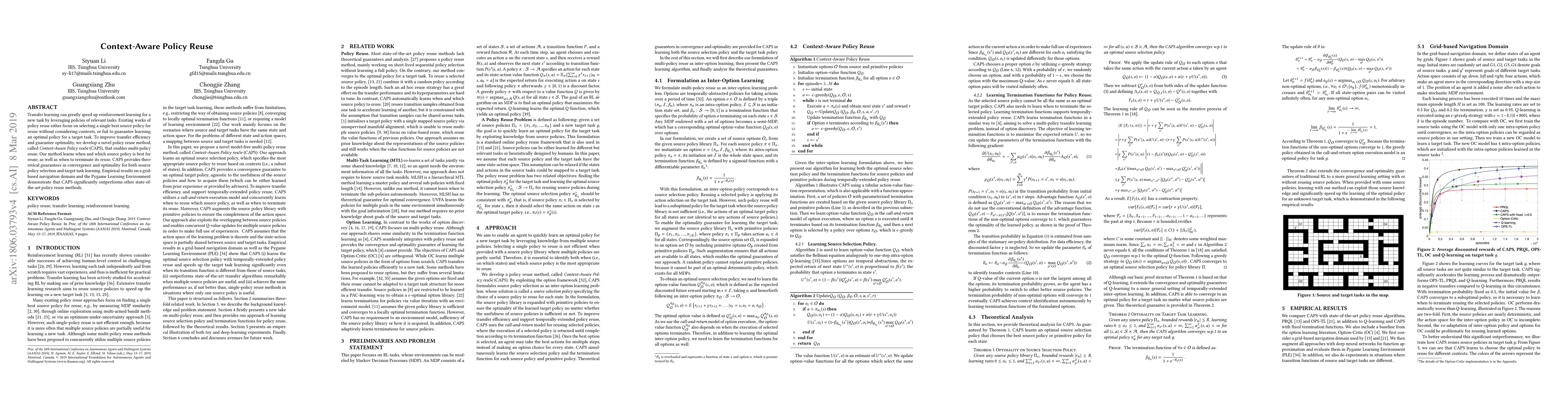 The paper introduces Context-Aware Policy reuSe (CAPS), a novel method for multi-policy transfer in reinforcement learning that selects the best source policy based on context and guarantees optimality. CAPS outperforms existing methods in grid-based navigation and the Pygame Learning Environment.