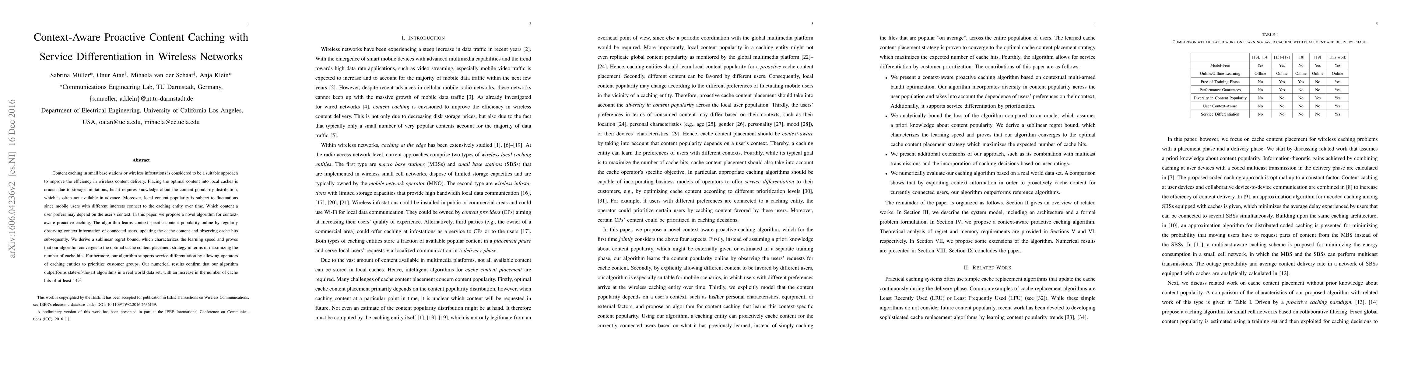This paper proposes a context-aware proactive content caching algorithm that learns user context to optimize cache content and maximize cache hits. The algorithm supports service differentiation, allowing prioritization of customer groups, and outperforms existing methods by at least 14% in real-world data.