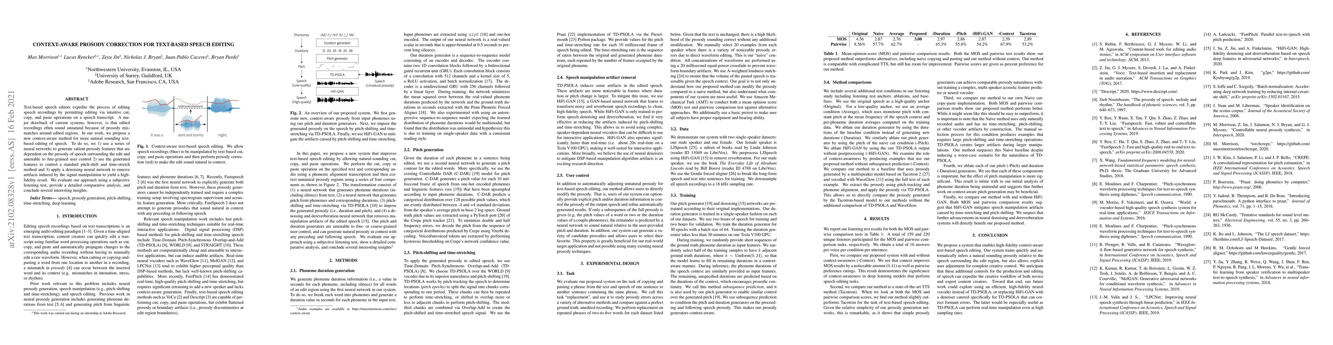This paper proposes a context-aware method for text-based speech editing that generates natural-sounding prosody features using neural networks, controls pitch-shift and time-stretch, and applies denoising to remove artifacts, achieving high-fidelity results. The approach is evaluated through subjective listening tests and comparative analysis.