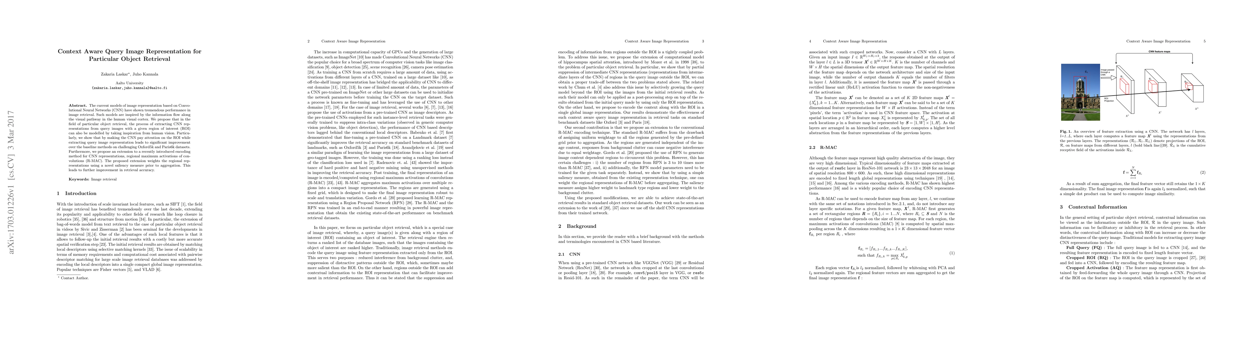 The current models of image representation based on Convolutional Neural Networks (CNN) have shown tremendous performance in image retrieval. Such models are inspired by the information flow along the visual pathway in the human visual cortex. We propose that in the field of particular object retrieval, the process of extracting CNN representations from query images with a given region of interest (ROI) can also be modelled by taking inspiration from human vision. Particularly, we show that by making the CNN pay attention on the ROI while extracting query image representation leads to significant improvement over the baseline methods on challenging Oxford5k and Paris6k datasets. Furthermore, we propose an extension to a recently introduced encoding method for CNN representations, regional maximum activations of convolutions (R-MAC). The proposed extension weights the regional representations using a novel saliency measure prior to aggregation. This leads to further improvement in retrieval accuracy.