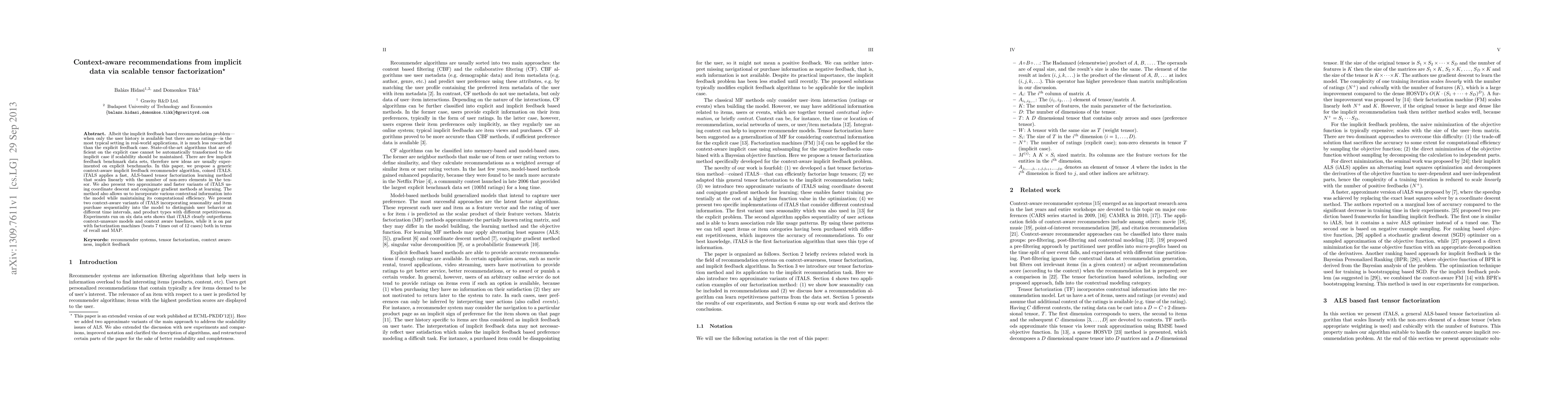 This paper proposes iTALS, a scalable tensor factorization algorithm for context-aware recommendations based on implicit feedback. It outperforms context-unaware models and baselines while maintaining computational efficiency, especially when incorporating contextual information like seasonality and item purchase sequentiality.
