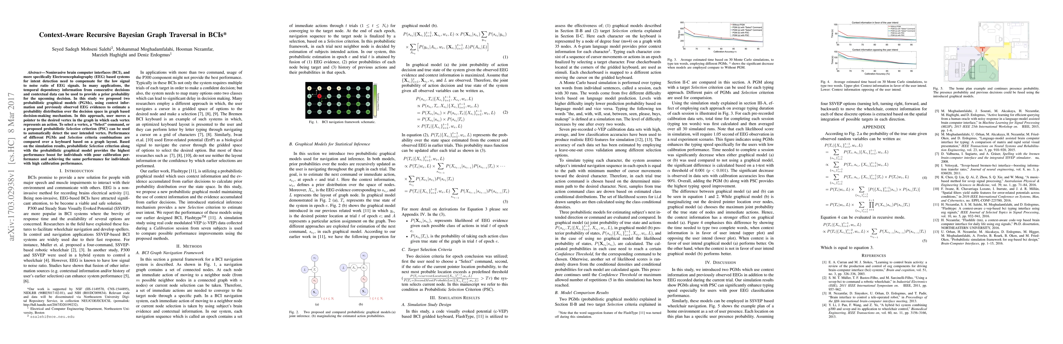Noninvasive brain computer interfaces (BCI), and more specifically Electroencephalography (EEG) based systems for intent detection need to compensate for the low signal to noise ratio of EEG signals. In many applications, the temporal dependency information from consecutive decisions and contextual data can be used to provide a prior probability for the upcoming decision. In this study we proposed two probabilistic graphical models (PGMs), using context information and previously observed EEG evidences to estimate a probability distribution over the decision space in graph based decision-making mechanism. In this approach, user moves a pointer to the desired vertex in the graph in which each vertex represents an action. To select a vertex, a Select command, or a proposed probabilistic Selection criterion (PSC) can be used to automatically detect the user intended vertex. Performance of different PGMs and Selection criteria combinations are compared over a keyboard based on a graph layout. Based on the simulation results, probabilistic Selection criterion along with the probabilistic graphical model provides the highest performance boost for individuals with pour calibration performance and achieving the same performance for individuals with high calibration performance.