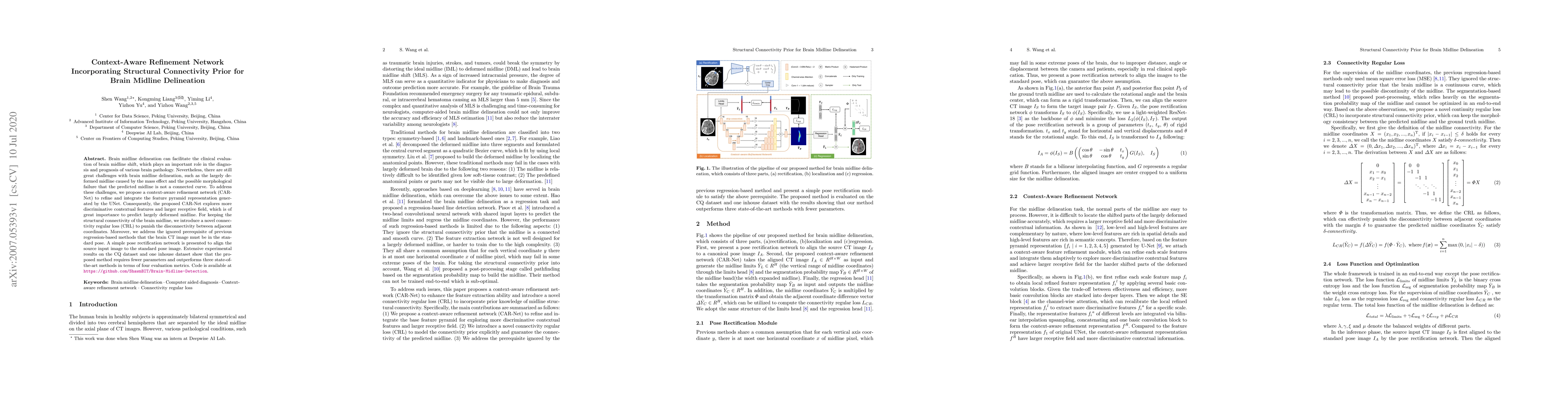 Researchers propose a new method called Context-Aware Refinement Network (CAR-Net) to improve brain midline delineation accuracy, offering better performance and fewer parameters than existing methods.
