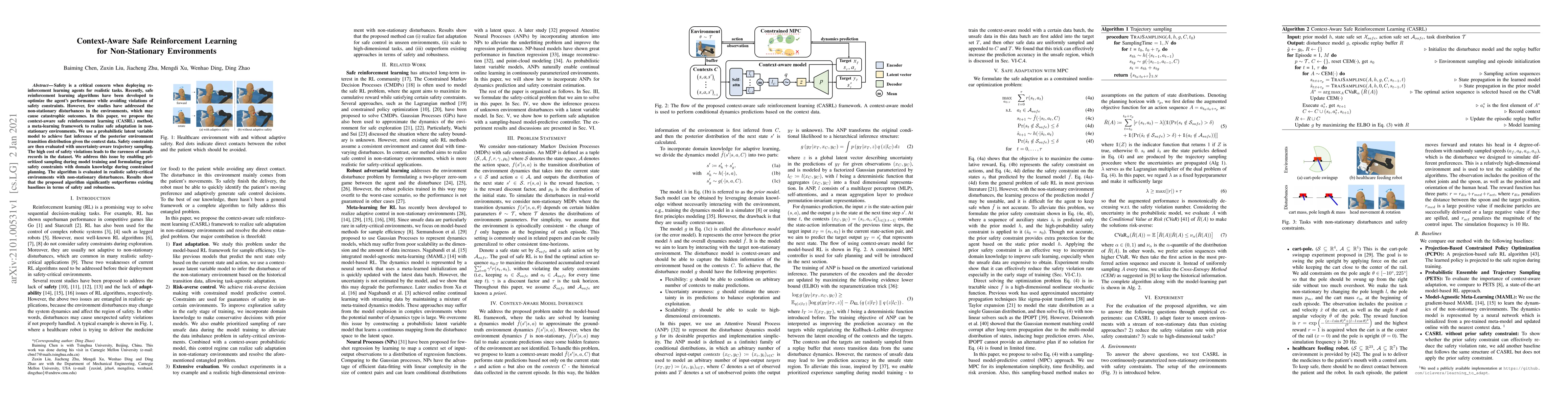 This paper proposes a context-aware safe reinforcement learning (CASRL) method for adapting to non-stationary environments, using a meta-learning framework with probabilistic modeling and uncertainty-aware safety evaluation. The method prioritizes safety through prioritized sampling and domain knowledge, demonstrating superior safety and robustness in realistic, non-stationary settings.