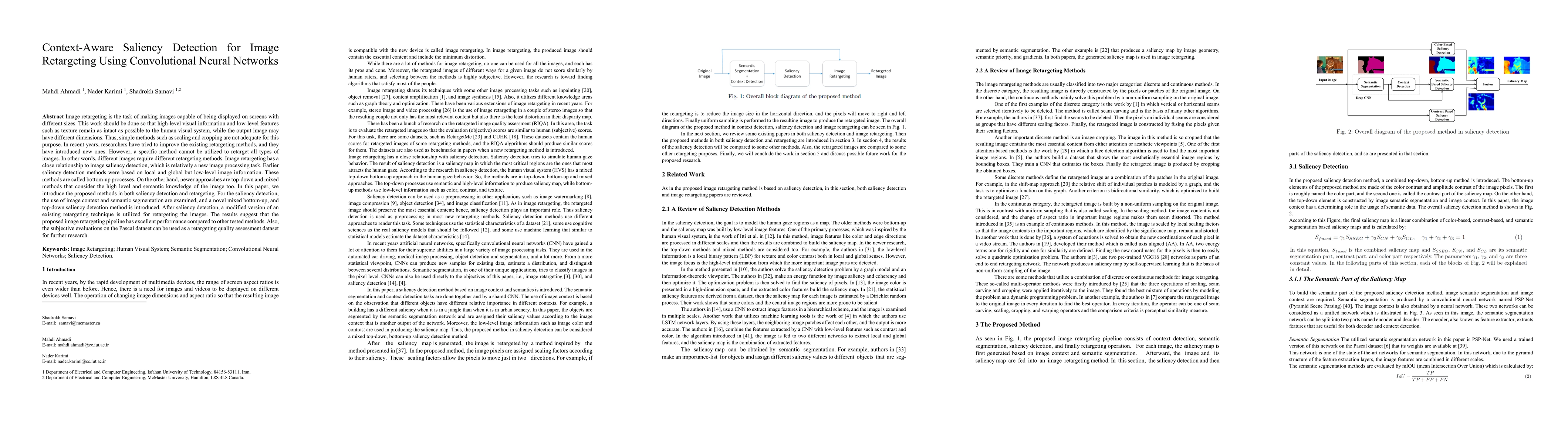 This research introduces a context-aware saliency detection method for image retargeting using Convolutional Neural Networks (CNNs), combining high-level semantic segmentation and low-level contrast information. The saliency detection method is trained on Pascal VOC2012, COCO, and CUHK datasets, with a modified Pixel Fusion retargeting method applied thereafter.