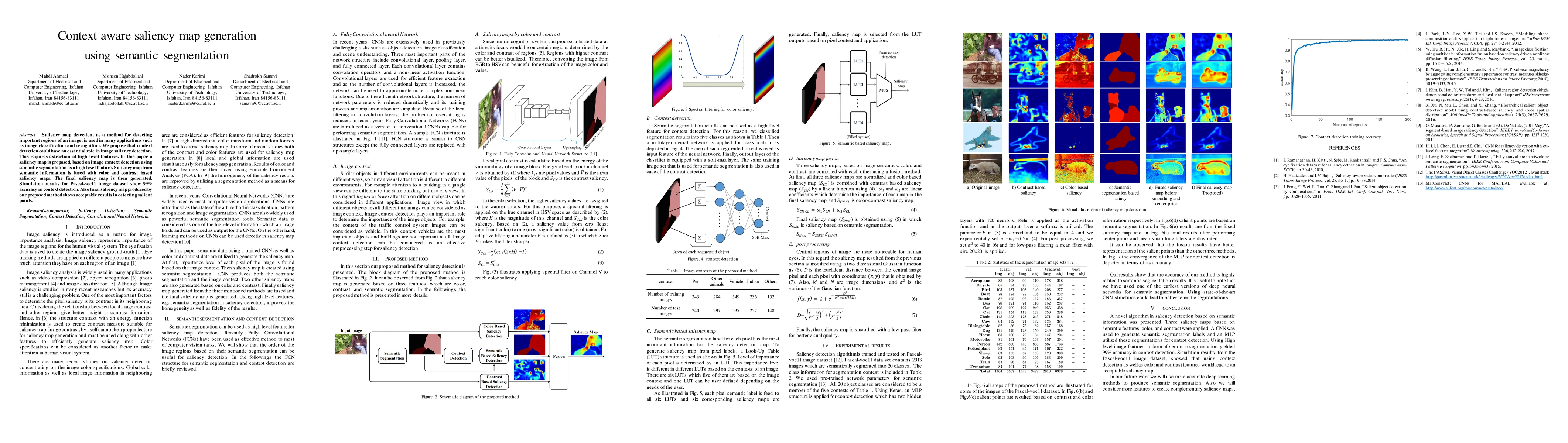 This paper proposes a saliency map generation method that integrates context detection through semantic segmentation to extract high-level features, fusing these with color and contrast-based saliency maps. Simulation results on the Pascal-VOC11 dataset demonstrate 99% accuracy in context detection and effective salient point identification.