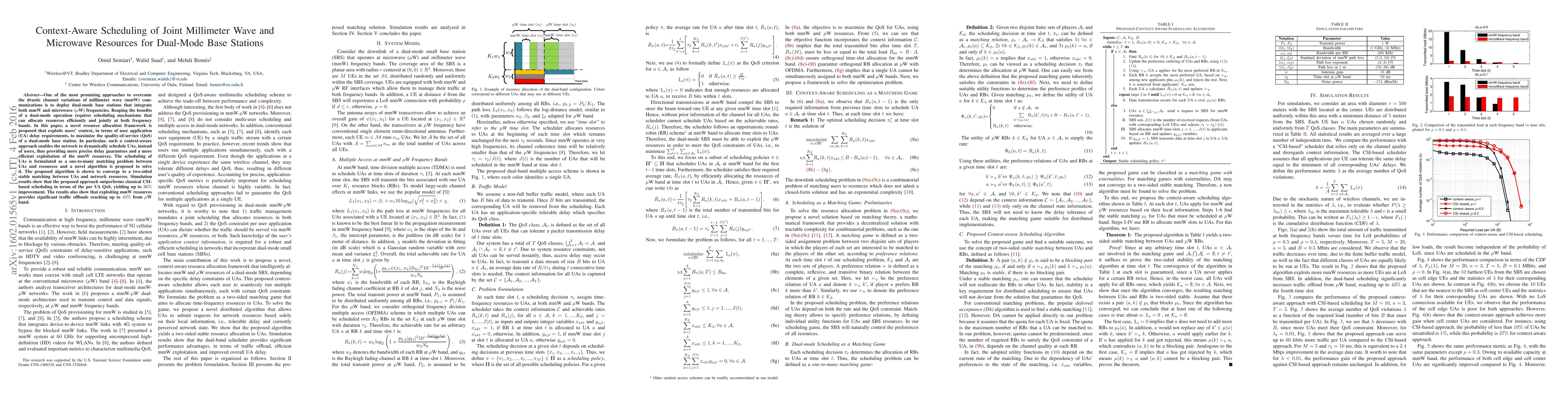 This paper proposes a context-aware scheduling framework for dual-mode base stations integrating millimeter wave and microwave frequencies to maximize QoS by dynamically matching user applications to resources based on delay requirements. The approach achieves up to 36% improvement in per user application QoS and up to 43% traffic offload from the microwave band.