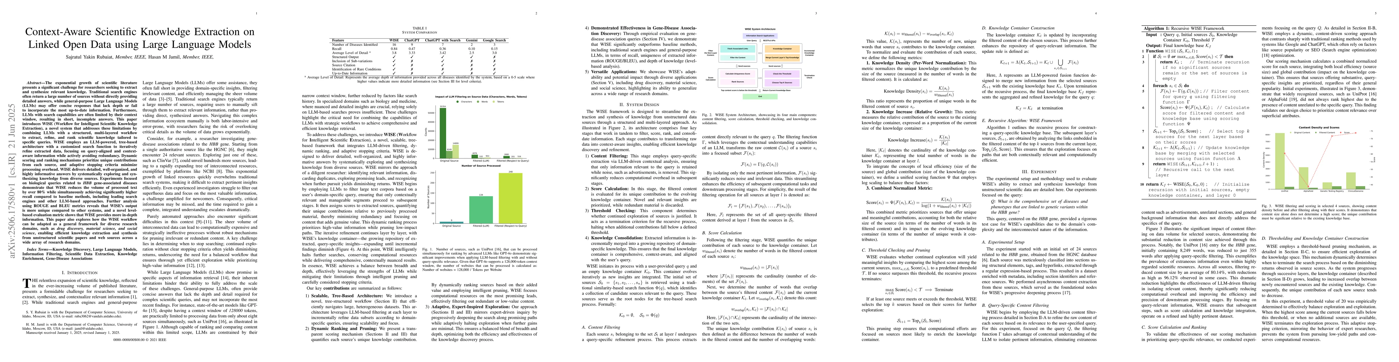 The paper introduces WISE, a system using large language models (LLMs) to extract and synthesize scientific knowledge from literature. WISE overcomes LLM limitations by employing a structured workflow, focusing on context-aware, non-redundant information, and significantly outperforms traditional search engines and other LLM-based approaches in detail and uniqueness, as demonstrated in HBB gene-associated disease studies.