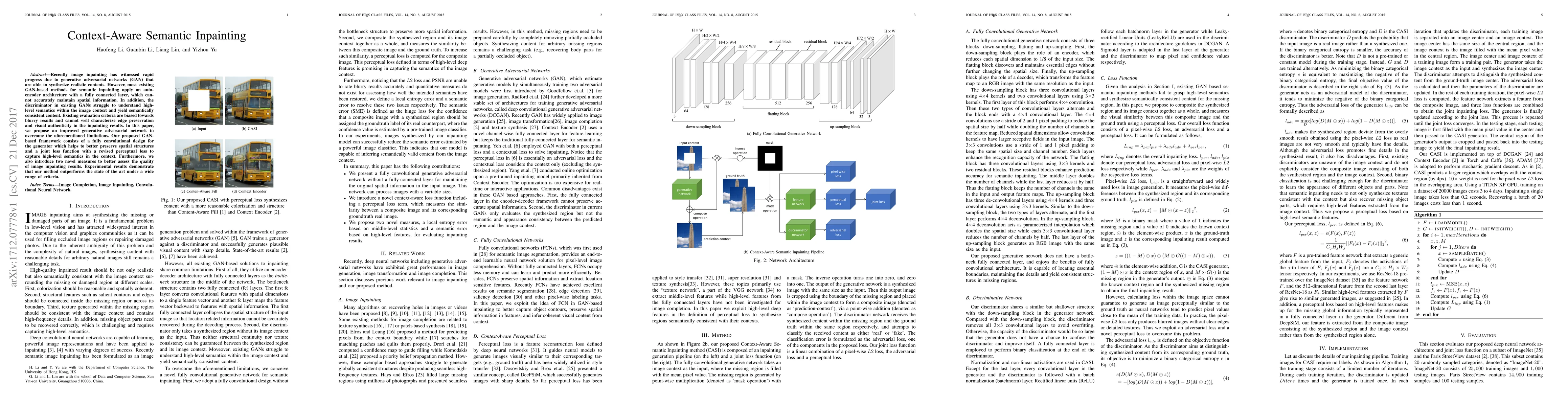 This paper proposes an improved GAN-based framework for semantic inpainting that utilizes a fully convolutional generator to preserve spatial information and a joint loss function to capture high-level semantics. The method also introduces new evaluation metrics for better assessment of inpainting quality, outperforming existing approaches.
