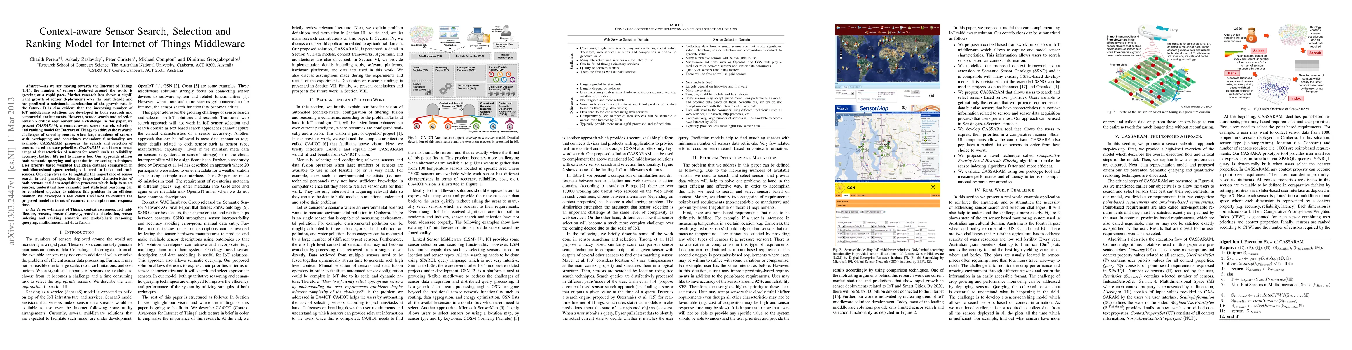 This paper introduces CASSARAM, a context-aware sensor search, selection, and ranking model for IoT middleware, addressing the challenges of selecting appropriate sensors from large, overlapping datasets. The model combines semantic querying and quantitative reasoning to prioritize and rank sensors based on user-defined characteristics.