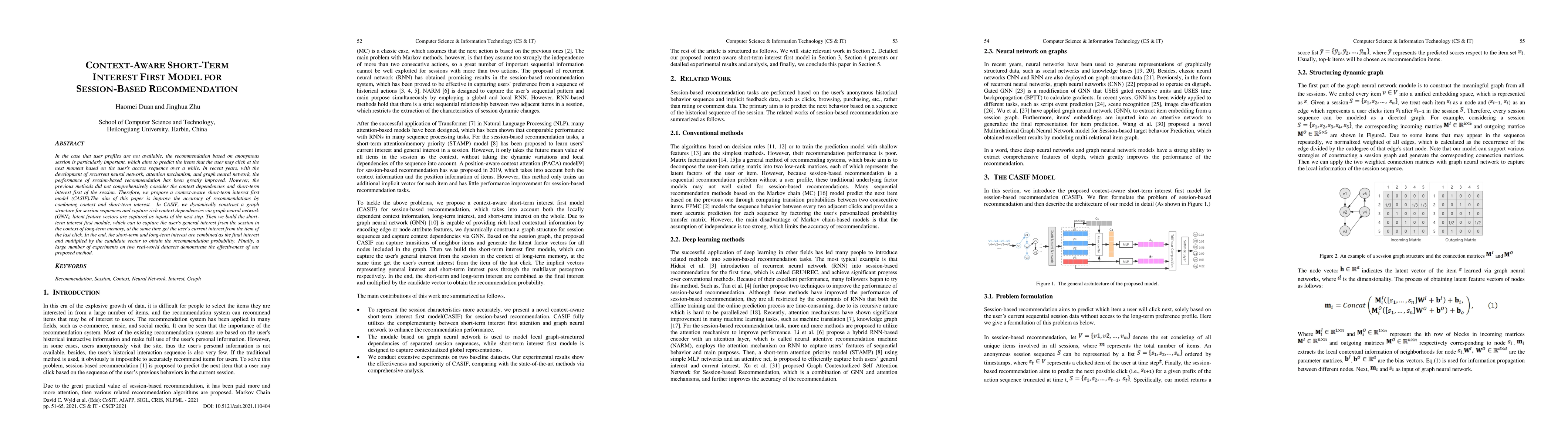 This paper introduces a context-aware short-term interest first model (CASIF) to enhance session-based recommendation accuracy without user profiles. CASIF uses a graph neural network to capture context dependencies and a short-term interest first module to balance long-term and recent user interests, improving recommendation precision as shown by experiments on real datasets.