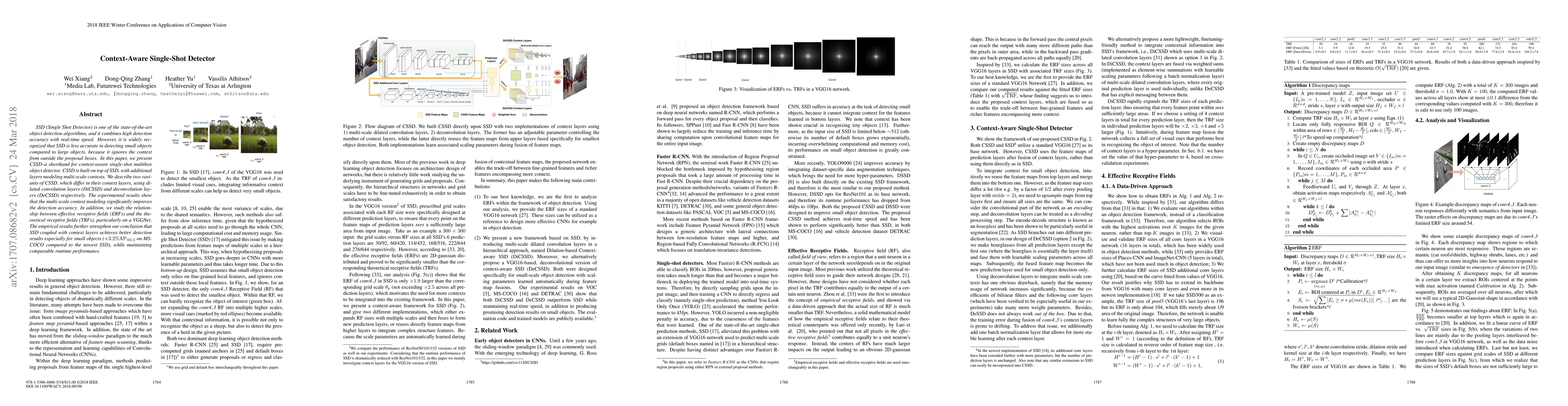 The introduction of context-aware single-shot multibox object detector (CSSD) with two variants (DiCSSD and DeCSSD) that model multi-scale contexts using dilated and deconvolution layers, respectively.