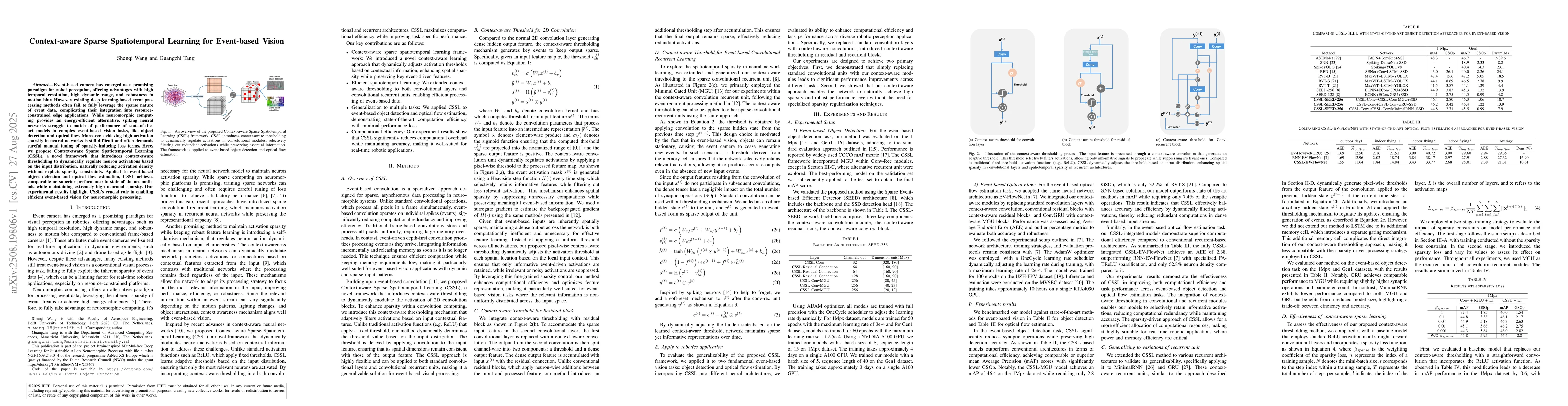 Event-based camera has emerged as a promising paradigm for robot perception, offering advantages with high temporal resolution, high dynamic range, and robustness to motion blur. However, existing deep learning-based event processing methods often fail to fully leverage the sparse nature of event data, complicating their integration into resource-constrained edge applications. While neuromorphic computing provides an energy-efficient alternative, spiking neural networks struggle to match of performance of state-of-the-art models in complex event-based vision tasks, like object detection and optical flow. Moreover, achieving high activation sparsity in neural networks is still difficult and often demands careful manual tuning of sparsity-inducing loss terms. Here, we propose Context-aware Sparse Spatiotemporal Learning (CSSL), a novel framework that introduces context-aware thresholding to dynamically regulate neuron activations based on the input distribution, naturally reducing activation density without explicit sparsity constraints. Applied to event-based object detection and optical flow estimation, CSSL achieves comparable or superior performance to state-of-the-art methods while maintaining extremely high neuronal sparsity. Our experimental results highlight CSSL's crucial role in enabling efficient event-based vision for neuromorphic processing.