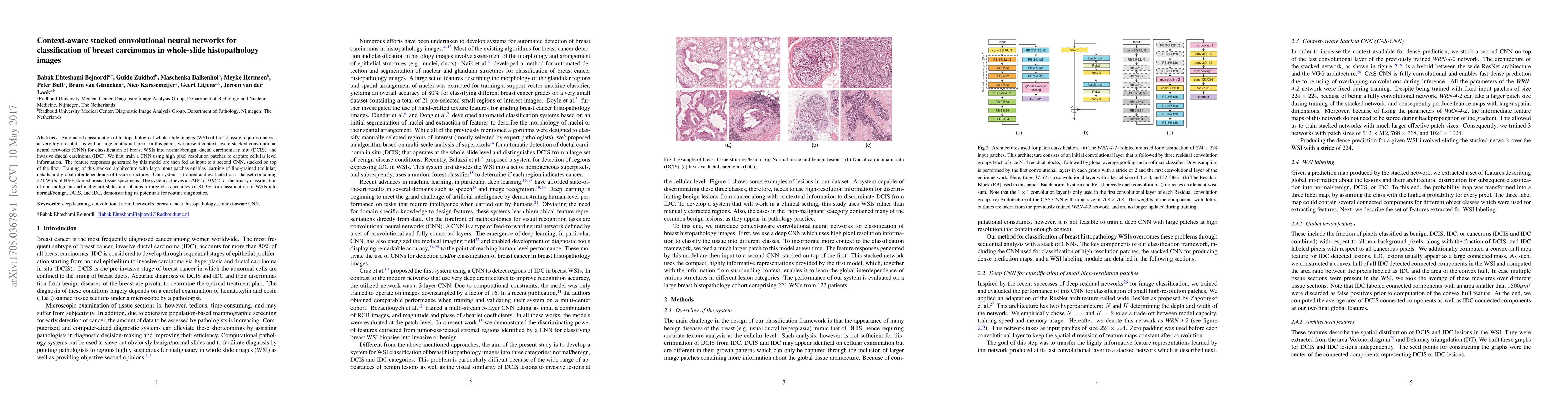 Automated classification of histopathological whole-slide images (WSI) of breast tissue requires analysis at very high resolutions with a large contextual area. In this paper, we present context-aware stacked convolutional neural networks (CNN) for classification of breast WSIs into normal/benign, ductal carcinoma in situ (DCIS), and invasive ductal carcinoma (IDC). We first train a CNN using high pixel resolution patches to capture cellular level information. The feature responses generated by this model are then fed as input to a second CNN, stacked on top of the first. Training of this stacked architecture with large input patches enables learning of fine-grained (cellular) details and global interdependence of tissue structures. Our system is trained and evaluated on a dataset containing 221 WSIs of H&E stained breast tissue specimens. The system achieves an AUC of 0.962 for the binary classification of non-malignant and malignant slides and obtains a three class accuracy of 81.3% for classification of WSIs into normal/benign, DCIS, and IDC, demonstrating its potentials for routine diagnostics.