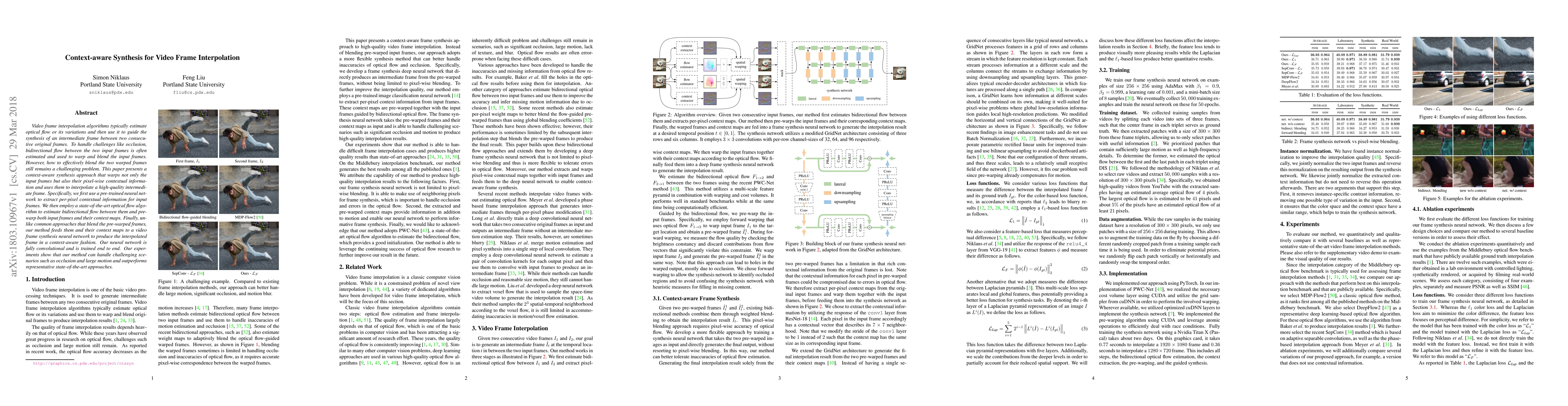This paper proposes a context-aware synthesis method for video frame interpolation that uses bidirectional optical flow to warp both input frames and their contextual information, then employs a neural network to interpolate a high-quality intermediate frame, outperforming existing state-of-the-art approaches in handling occlusion and large motion.