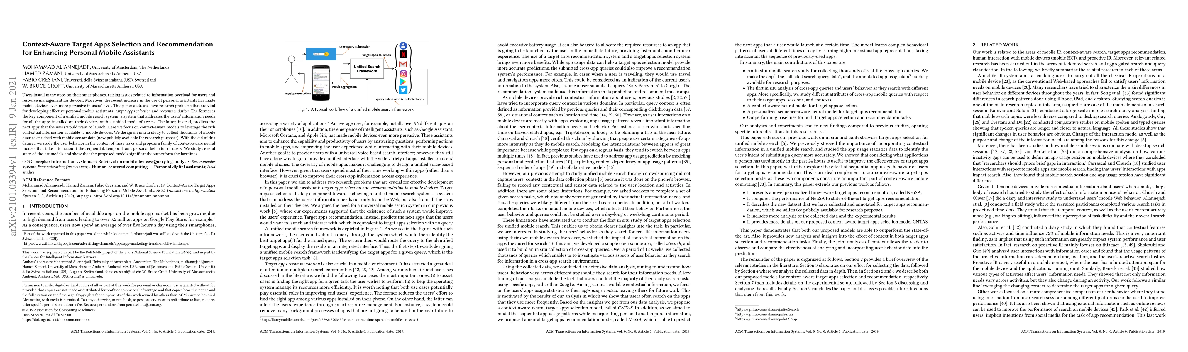 Users install many apps on their smartphones, raising issues related to information overload for users and resource management for devices. Moreover, the recent increase in the use of personal assistants has made mobile devices even more pervasive in users' lives. This paper addresses two research problems that are vital for developing effective personal mobile assistants: target apps selection and recommendation. The former is the key component of a unified mobile search system: a system that addresses the users' information needs for all the apps installed on their devices with a unified mode of access. The latter, instead, predicts the next apps that the users would want to launch. Here we focus on context-aware models to leverage the rich contextual information available to mobile devices. We design an in situ study to collect thousands of mobile queries enriched with mobile sensor data (now publicly available for research purposes). With the aid of this dataset, we study the user behavior in the context of these tasks and propose a family of context-aware neural models that take into account the sequential, temporal, and personal behavior of users. We study several state-of-the-art models and show that the proposed models significantly outperform the baselines.