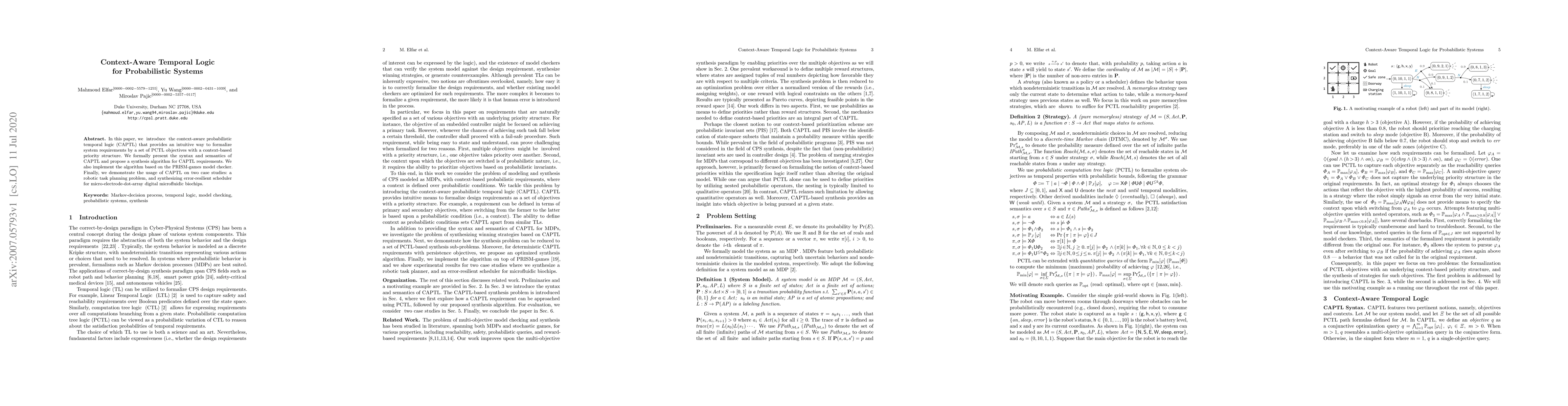 This paper introduces context-aware probabilistic temporal logic (CAPTL) to formalize system requirements with context-based priority structures. It presents CAPTL's syntax and semantics, proposes a synthesis algorithm, and demonstrates its application on robotic task planning and biochip scheduler synthesis.