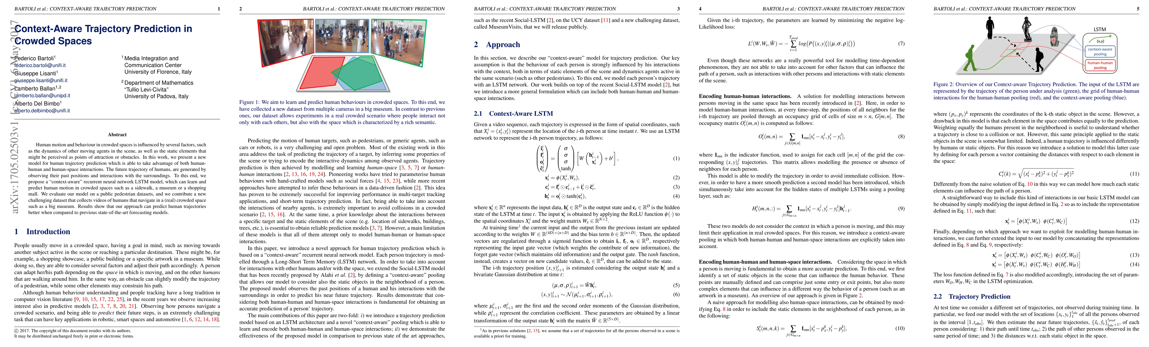 This paper introduces a context-aware LSTM model for predicting human trajectories in crowded spaces by considering both human-human and human-space interactions. The model outperforms previous methods, as demonstrated on public datasets and a newly contributed dataset of museum navigation.