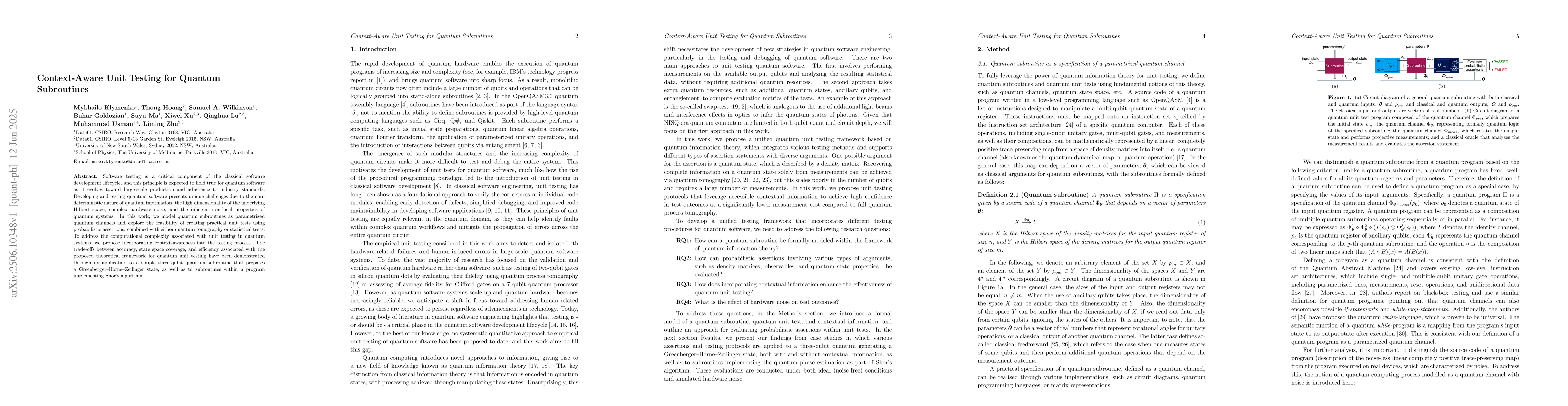 Researchers propose a new approach to unit testing quantum software that incorporates context-awareness to address challenges of non-determinism and high dimensionality. The method uses probabilistic assertions and statistical tests to create practical unit tests for complex quantum subroutines.