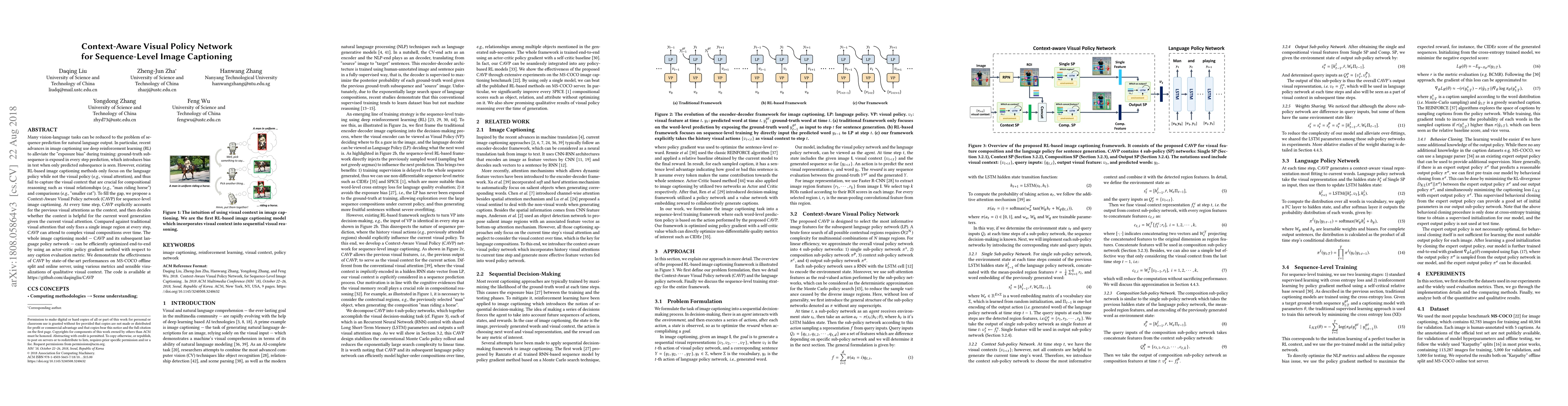 The paper proposes a Context-Aware Visual Policy (CAVP) network for sequence-level image captioning that incorporates previous visual attentions to enhance compositional reasoning. CAVP outperforms traditional methods by attending to complex visual compositions over time and achieves state-of-the-art performance on the MS-COCO dataset.
