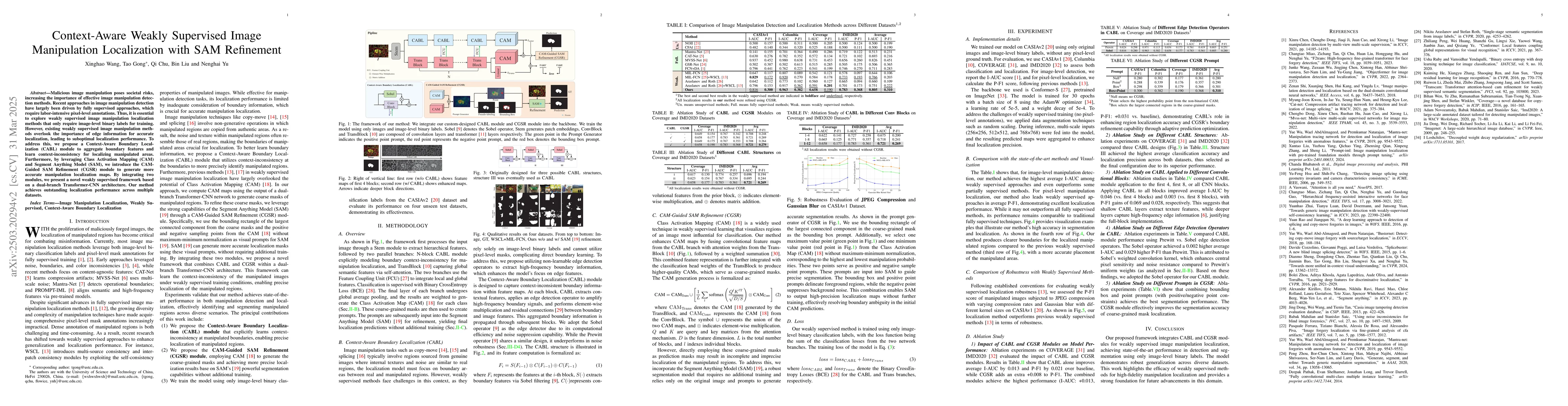 This paper proposes a novel weakly supervised framework for detecting and localizing manipulated areas in images using only binary labels. It introduces a Context-Aware Boundary Localization (CABL) module to enhance edge information and a CAM-Guided SAM Refinement (CGSR) module to improve localization accuracy, achieving superior performance across multiple datasets.