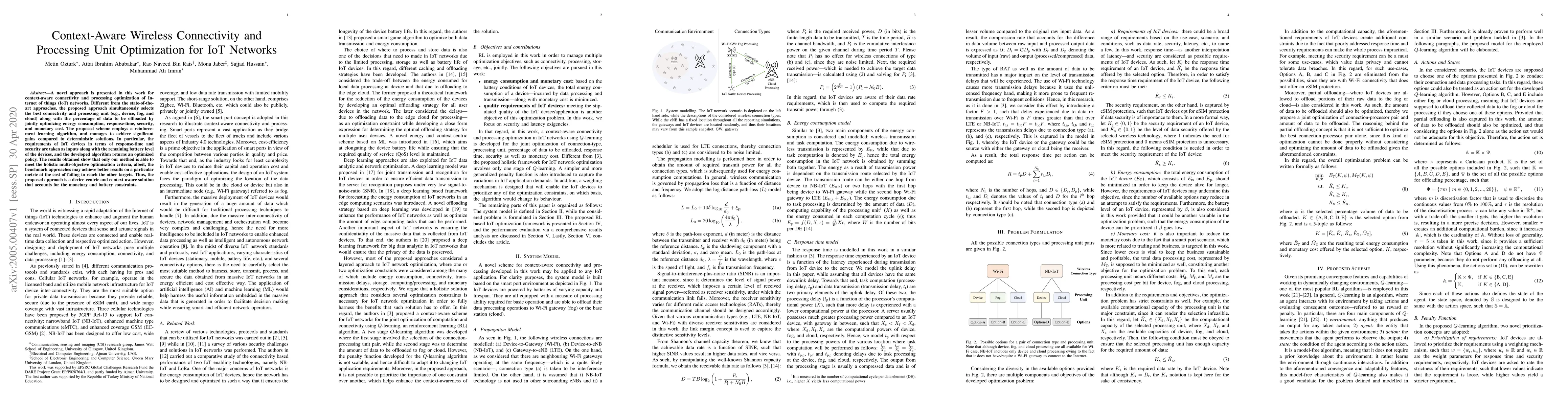 A novel approach is presented in this work for context-aware connectivity and processing optimization of Internet of things (IoT) networks. Different from the state-of-the-art approaches, the proposed approach simultaneously selects the best connectivity and processing unit (e.g., device, fog, and cloud) along with the percentage of data to be offloaded by jointly optimizing energy consumption, response-time, security, and monetary cost. The proposed scheme employs a reinforcement learning algorithm, and manages to achieve significant gains compared to deterministic solutions. In particular, the requirements of IoT devices in terms of response-time and security are taken as inputs along with the remaining battery level of the devices, and the developed algorithm returns an optimized policy. The results obtained show that only our method is able to meet the holistic multi-objective optimisation criteria, albeit, the benchmark approaches may achieve better results on a particular metric at the cost of failing to reach the other targets. Thus, the proposed approach is a device-centric and context-aware solution that accounts for the monetary and battery constraints.