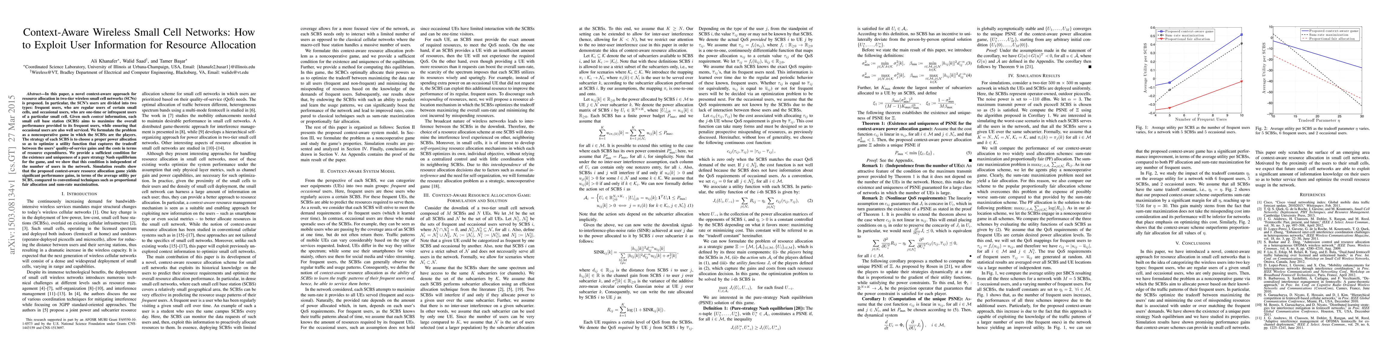 This paper proposes a novel context-aware resource allocation approach for two-tier wireless small cell networks, dividing users into frequent and occasional types. It formulates the problem as a noncooperative game to optimize power allocation, achieving significant performance gains over conventional methods.