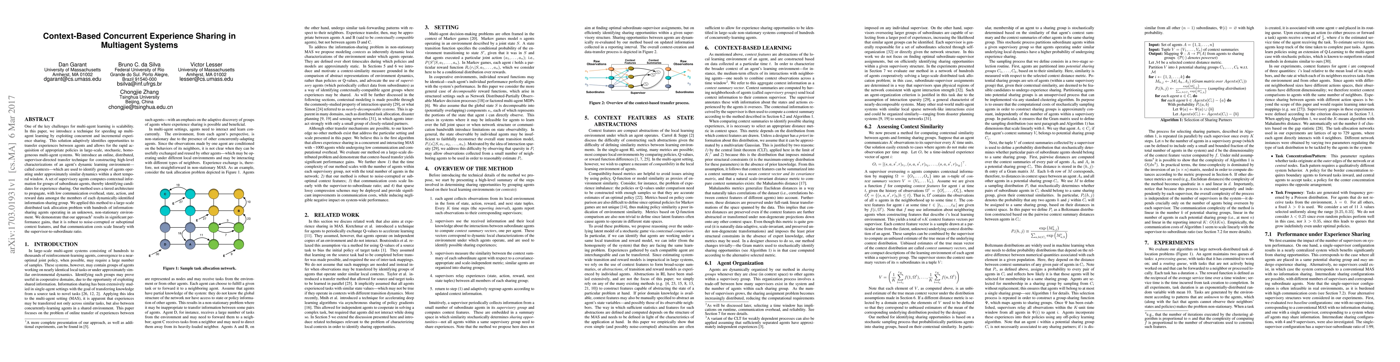 The paper introduces a context-based concurrent experience sharing technique for multi-agent learning, which adaptively identifies opportunities for experience transfer between agents in large-scale, stochastic, homogeneous multi-agent systems. It uses a tiered architecture for low-overhead communication of state, action, and reward data amongst dynamically identified information-sharing groups.