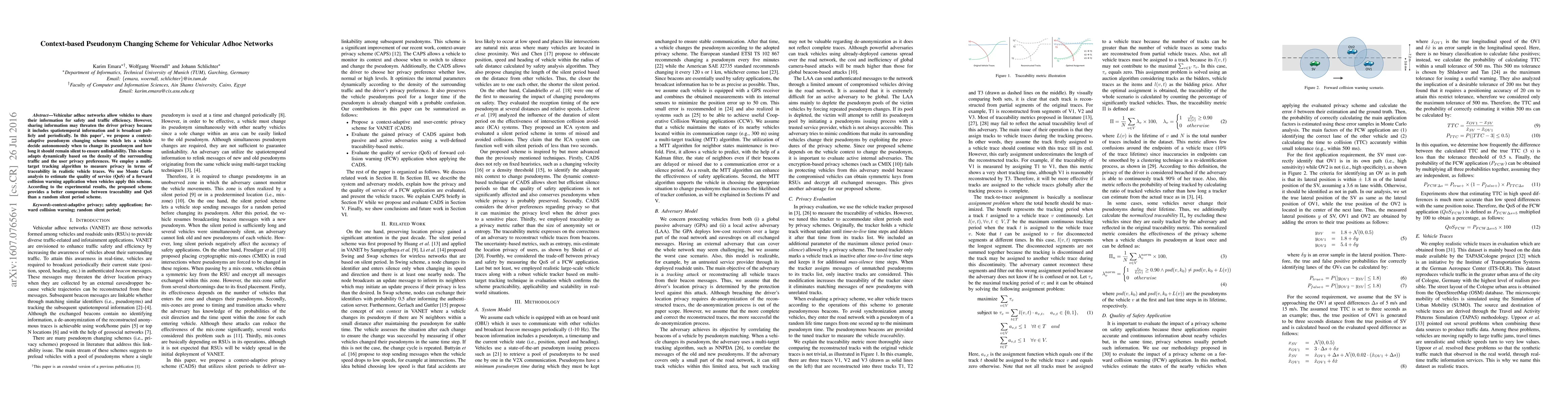 This paper proposes a context-adaptive pseudonym changing scheme for vehicular adhoc networks to enhance driver privacy by dynamically adjusting pseudonym changes based on traffic density and user preferences, while maintaining a balance between traceability and quality of service. Experimental results show it outperforms random silent periods in preserving privacy without significantly compromising safety applications.