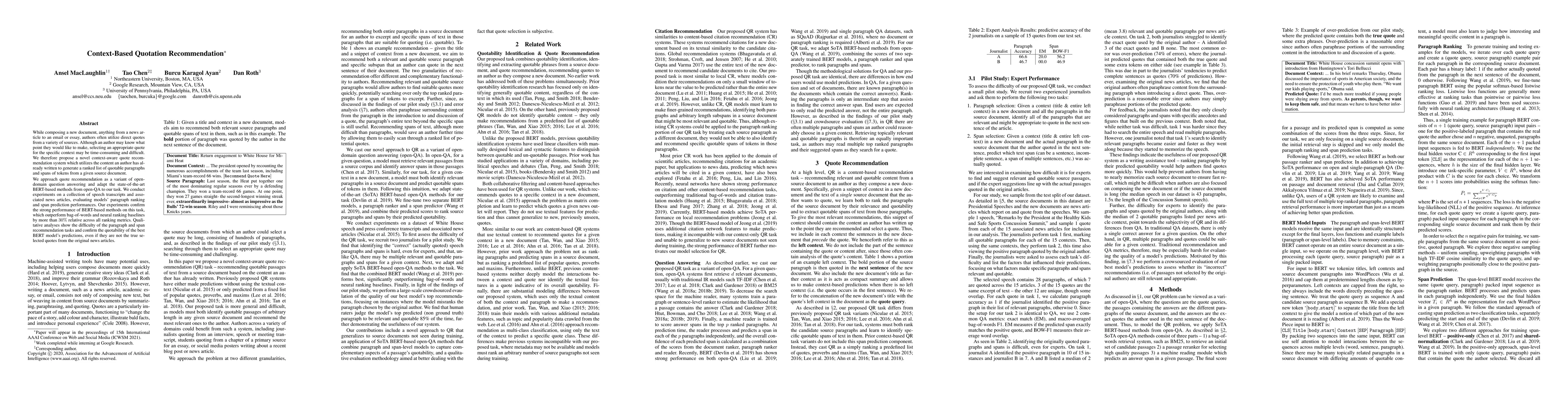 While composing a new document, anything from a news article to an email or essay, authors often utilize direct quotes from a variety of sources. Although an author may know what point they would like to make, selecting an appropriate quote for the specific context may be time-consuming and difficult. We therefore propose a novel context-aware quote recommendation system which utilizes the content an author has already written to generate a ranked list of quotable paragraphs and spans of tokens from a given source document. We approach quote recommendation as a variant of open-domain question answering and adapt the state-of-the-art BERT-based methods from open-QA to our task. We conduct experiments on a collection of speech transcripts and associated news articles, evaluating models' paragraph ranking and span prediction performances. Our experiments confirm the strong performance of BERT-based methods on this task, which outperform bag-of-words and neural ranking baselines by more than 30% relative across all ranking metrics. Qualitative analyses show the difficulty of the paragraph and span recommendation tasks and confirm the quotability of the best BERT model's predictions, even if they are not the true selected quotes from the original news articles.